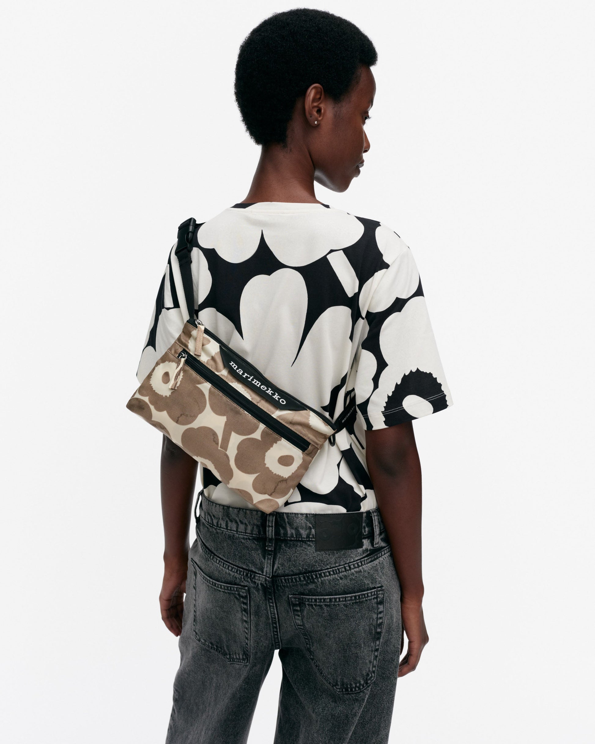 The Neat Crossbody S shoulder bag is made of recycled polyester in the Unikko pattern. The bag has an adjustable shoulder strap that is made of recycled polyamide. The small bag has a zipper closure, a zipper pocket and the Marimekko label on the front, and a slip-in pocket on the inside where the whole bag can be folded away for easy storage.