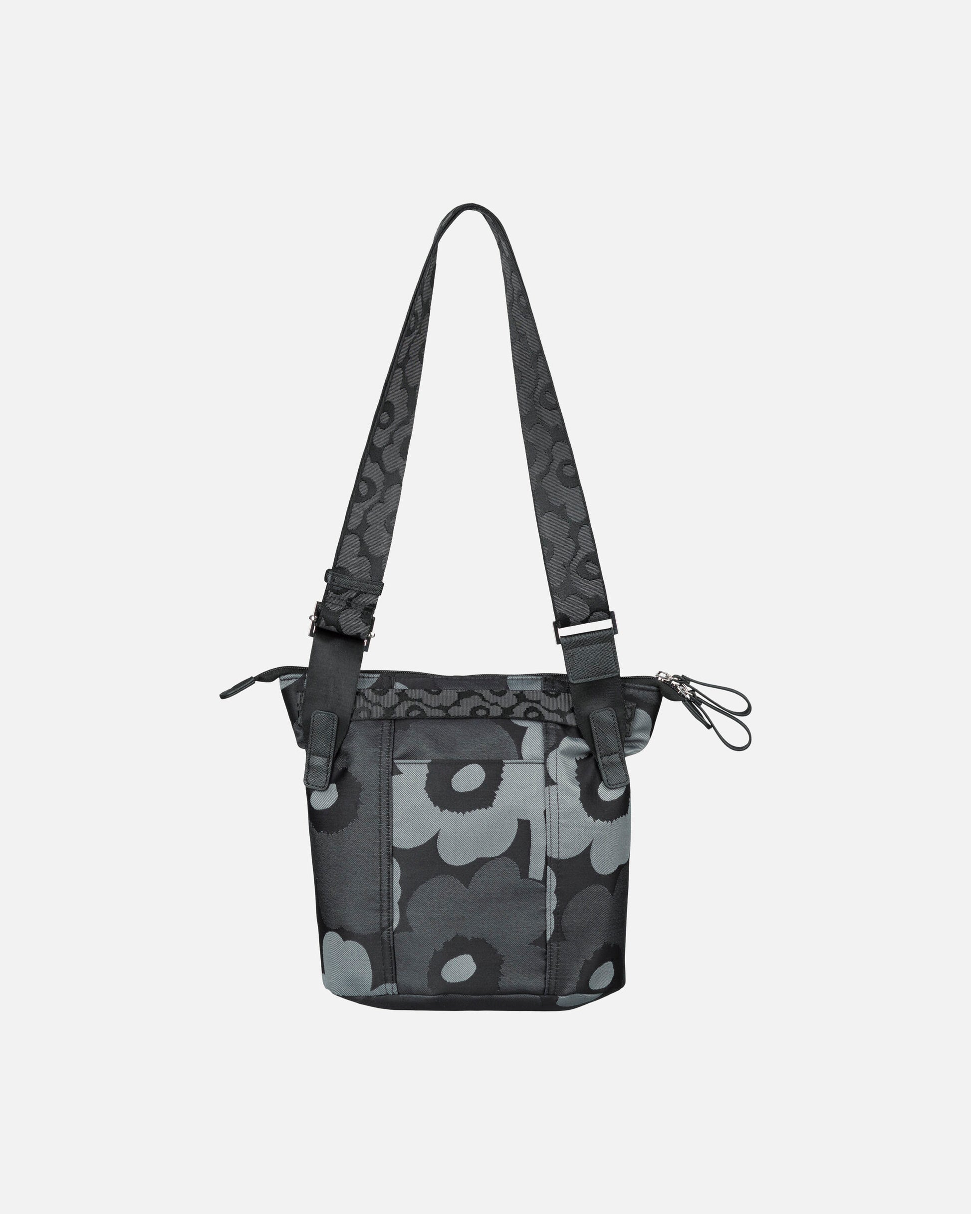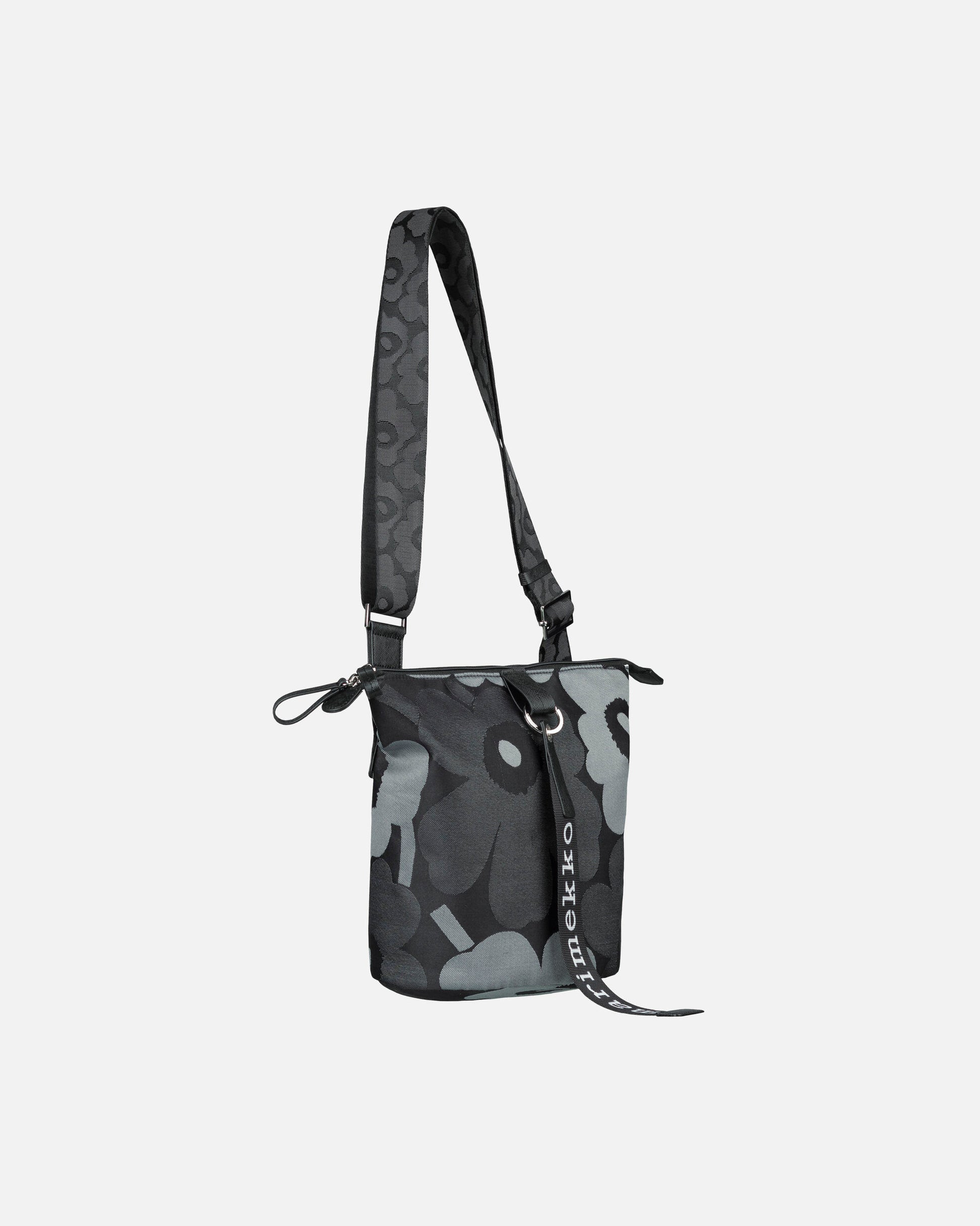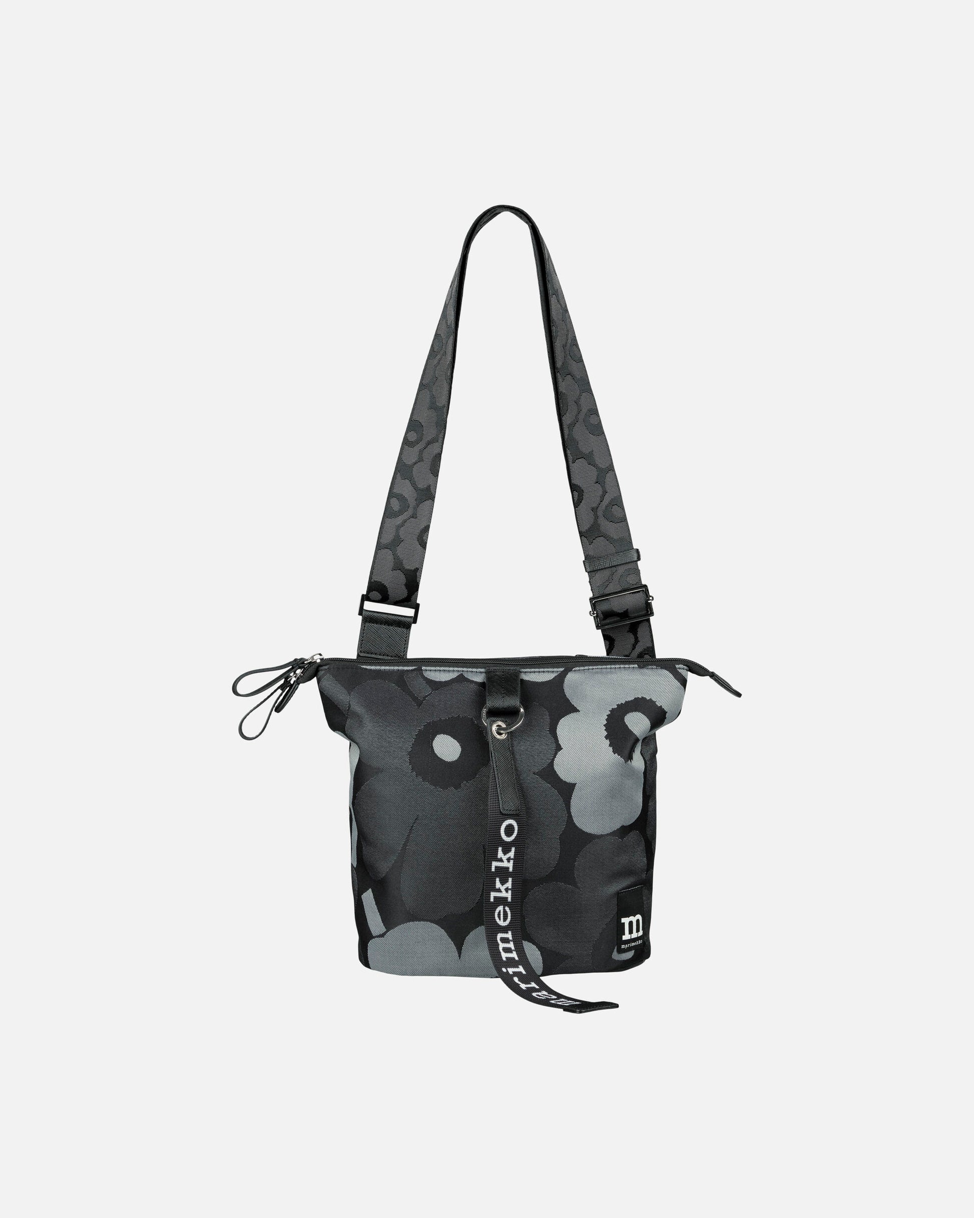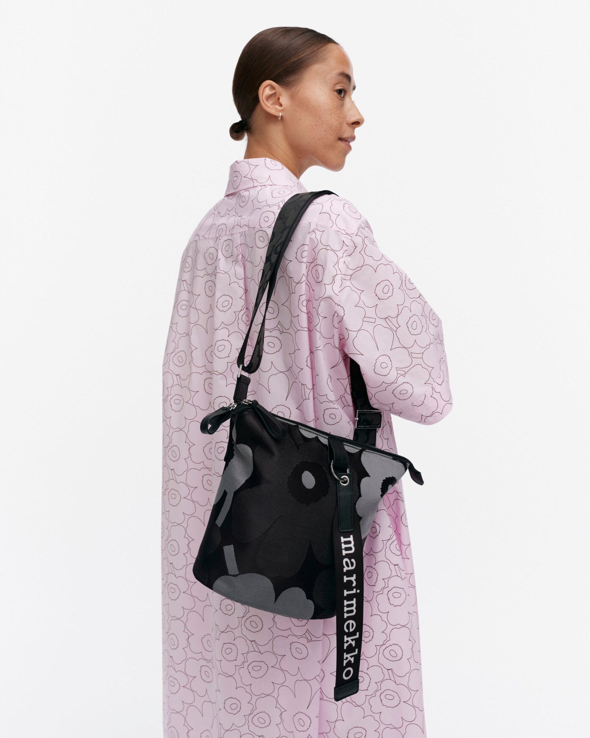 The Carry All Unikko shoulder bag has a zipper closure, a handle, and an adjustable, jacquard knit Unikko pattern shoulder strap. There is an open pocket on the inside and an open pocket on the outside. The Marimekko keychain is attached to the front.