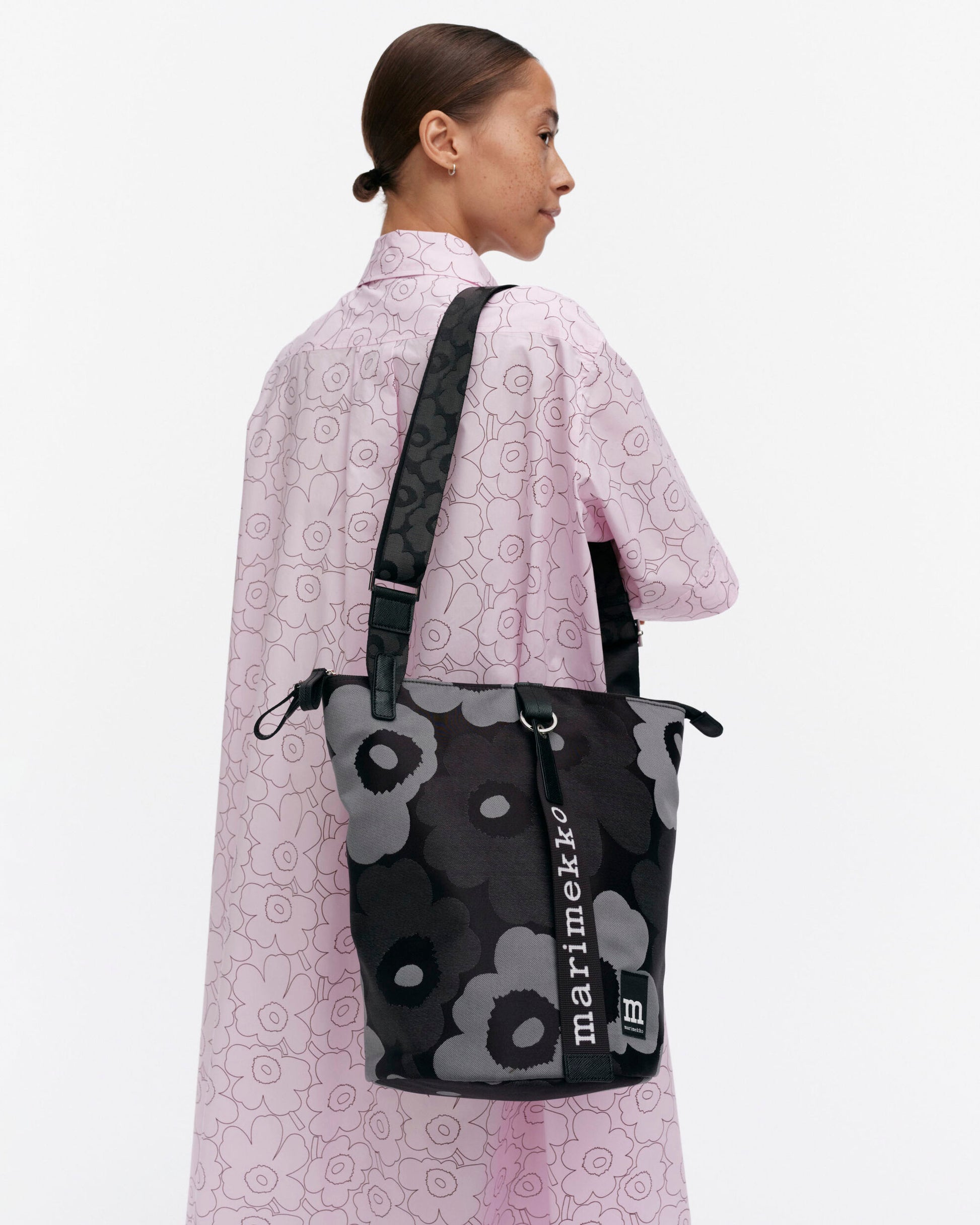 The All Day Bucket shoulder bag is made of recycled polyester with the jacquard knit Unikko pattern. The bag has three compartments: one with a zipper closure, one plain open compartment, and one open compartment with an inside pocket. The adjustable shoulder strap has the jacquard knit Unikko pattern.The front features the Marimekko keychain and there is a slip-in pocket in the back, which closes with a magnetic button.