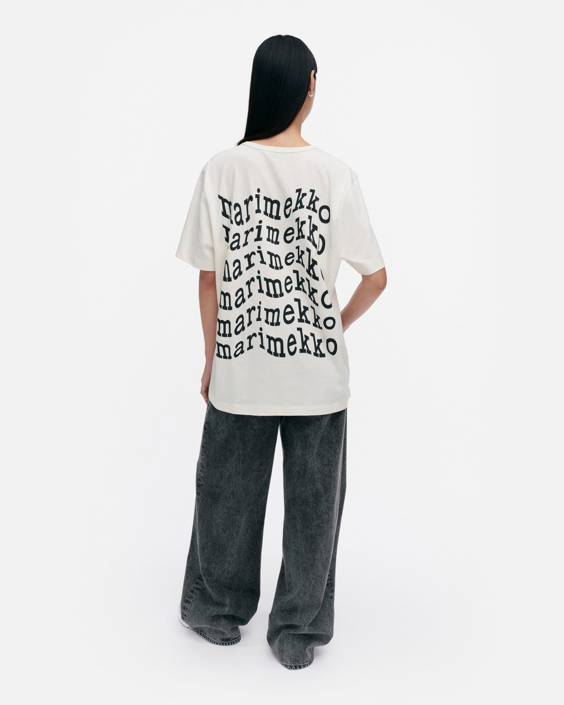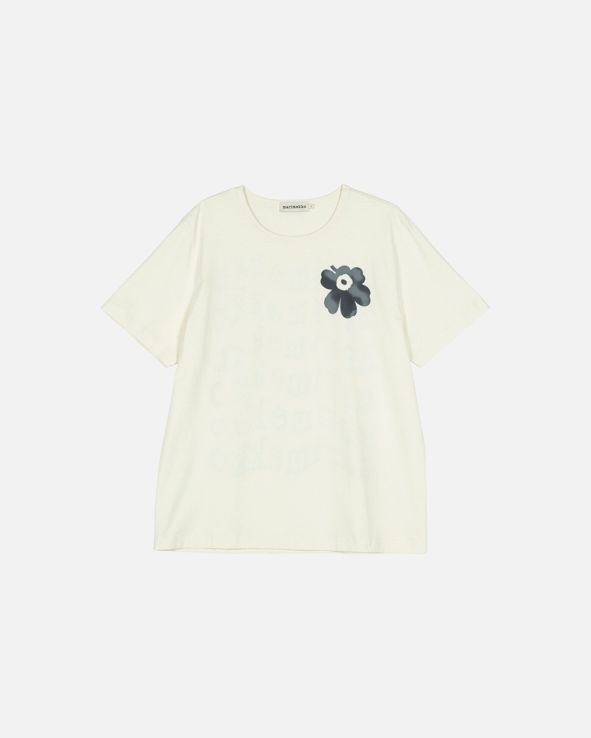 The Vihne t-shirt is made of organic cotton jersey, and it has a unisex fit. The t-shirt features the small placement print Akvarelli Unikko flower, which looks like it was painted with watercolours. The t-shirt has a ribbed O-neck and the big wavy Marimekko logo text is printed in the back backside.