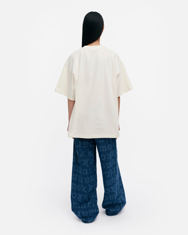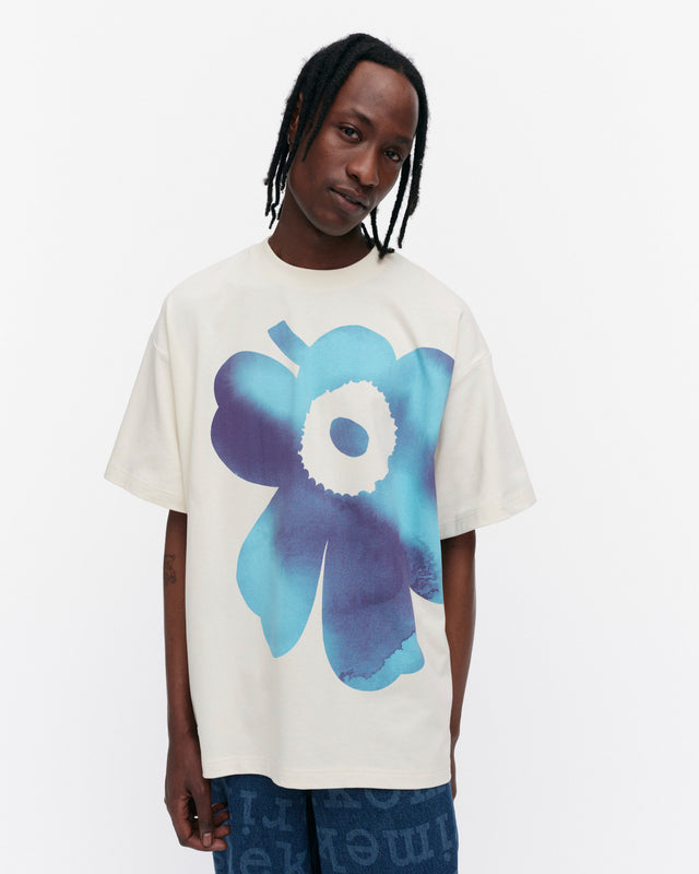The Nopeus t-shirt is made of organic cotton jersey, and it has a straight, unisex fit. The t-shirt has a ribbed O-neck, and it features the placement Akvarelli Unikko pattern, which looks like it was painted with watercolours.