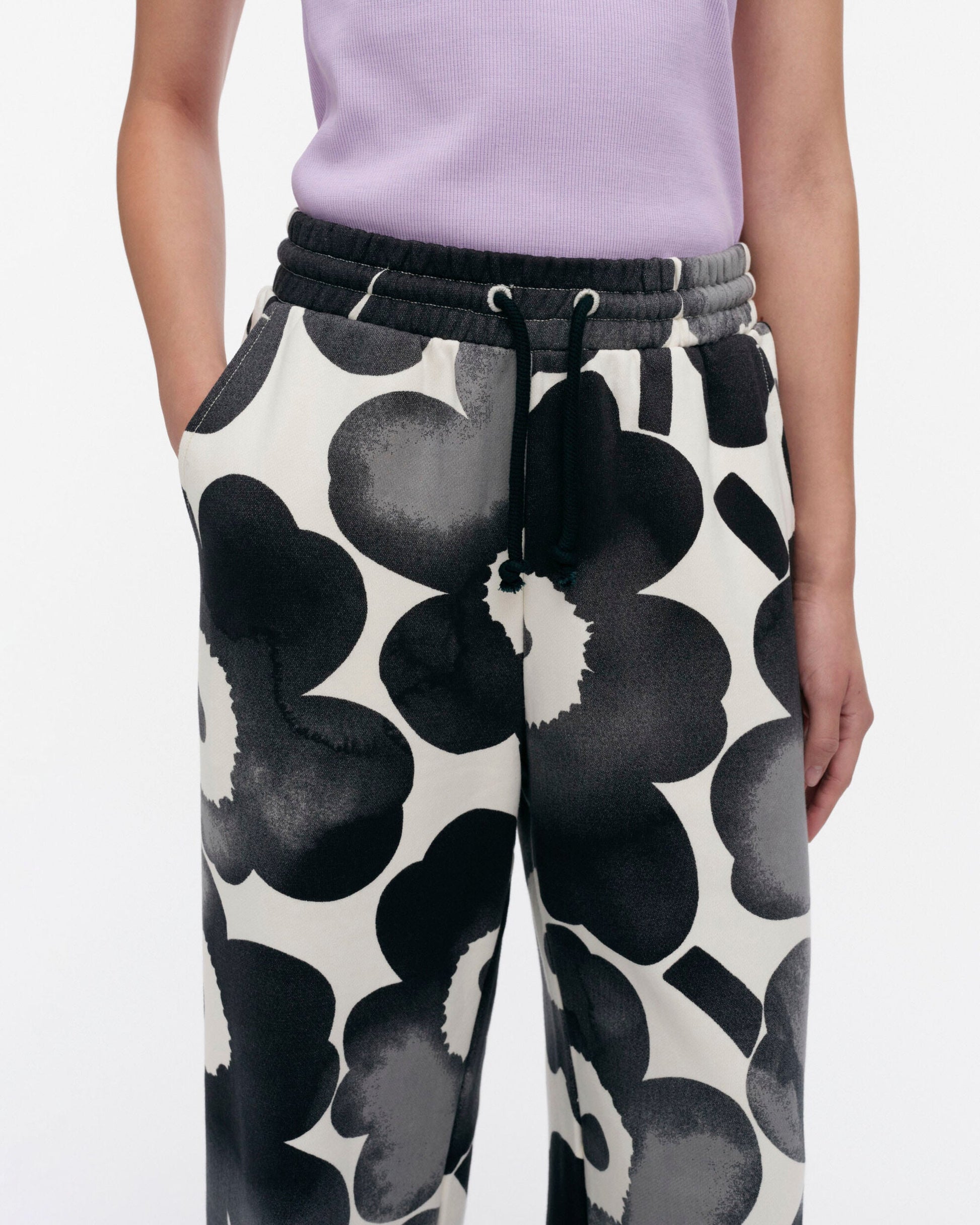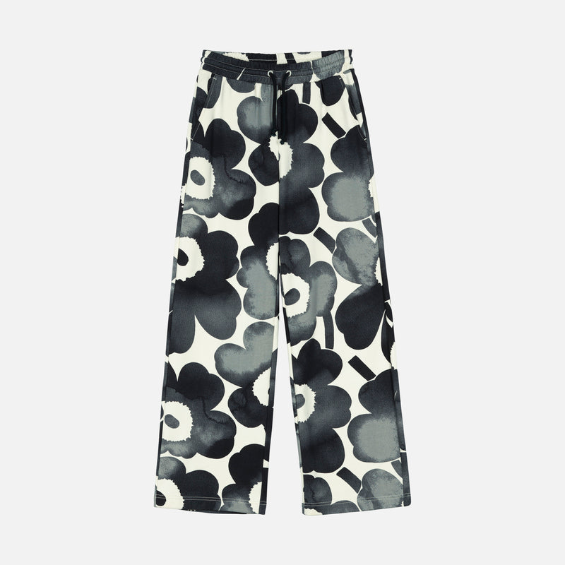 The Varret sweatpants are made of organic cotton French terry, and they have a relaxed, straight fit. The sweatpants feature the Akvarelli Unikko pattern, which looks like it was painted with watercolours. The sweatspants has an elastic waistband with drawstrings, and side seam pockets. The Marimekko logo is embroidered in the right back cuff.