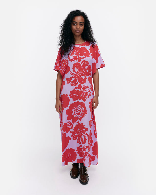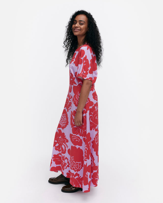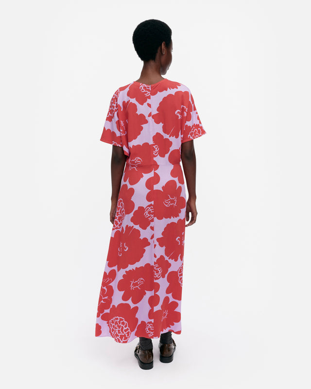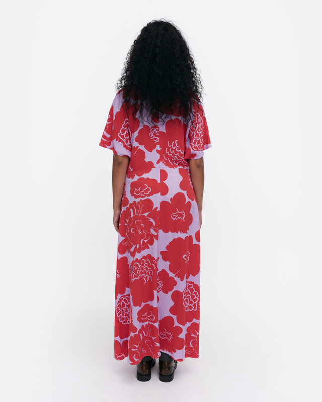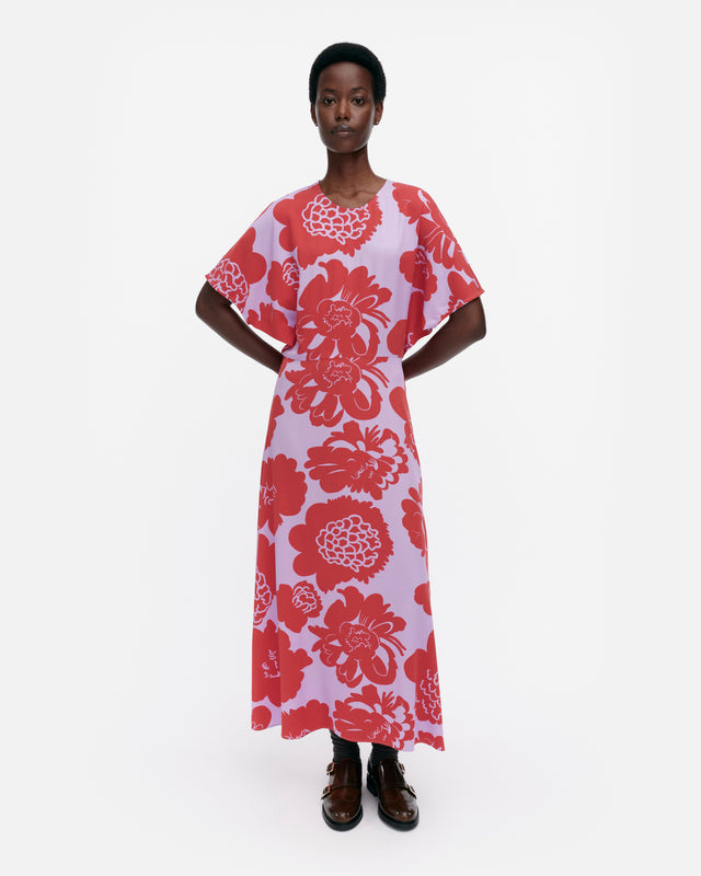 The Heleä dress is made of woven viscose fabric, and it has a slim fit, a straight top, and a flared cut hem. The dress features the Pioni pattern. It has an O-neck, a concealed zipper in the back seam, short kimono sleeves, and a waist seam.