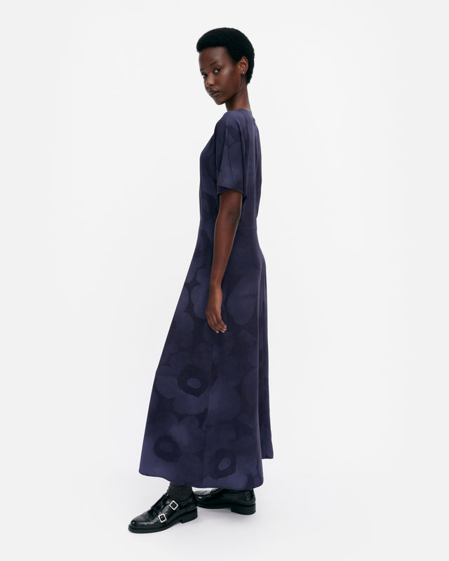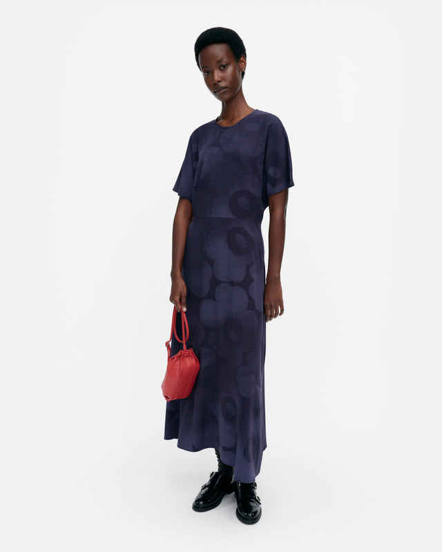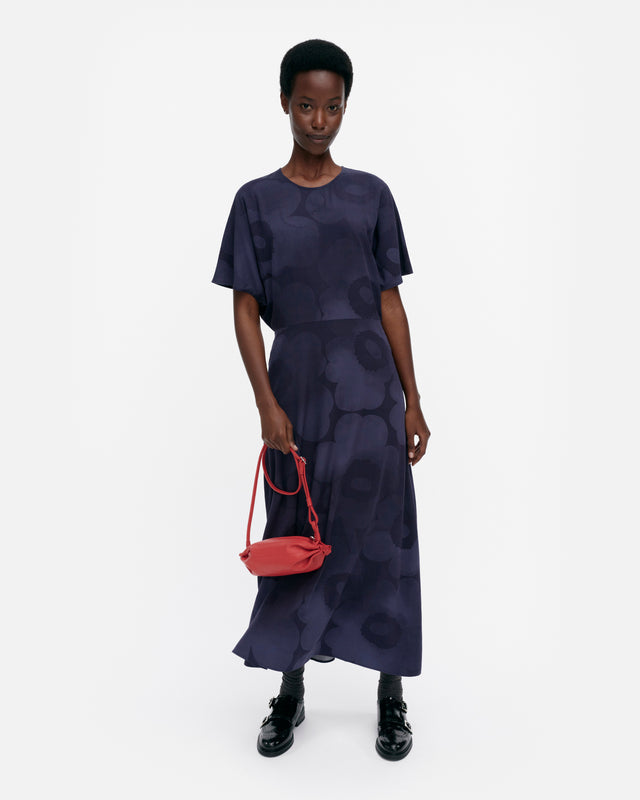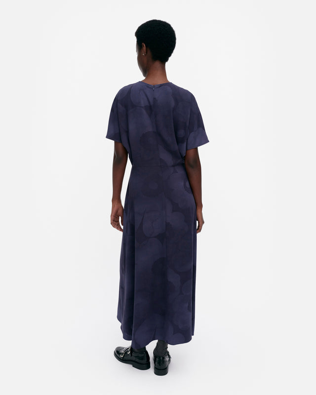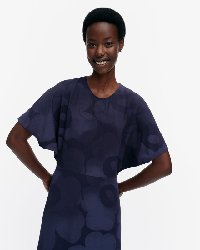 The Heleä dress is made of woven viscose fabric, and it has a slim fit, a straight top, and a flared cut hem. The dress features the Akvarelli Unikko pattern, which looks like it was painted with watercolours. It has an O-neck, a concealed zipper in the back seam, short kimono sleeves, and a waist seam.