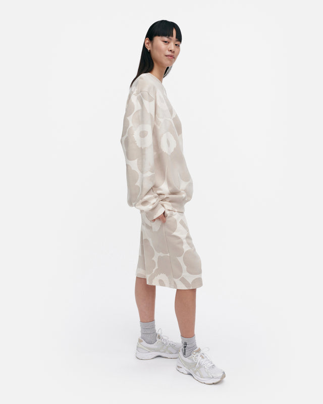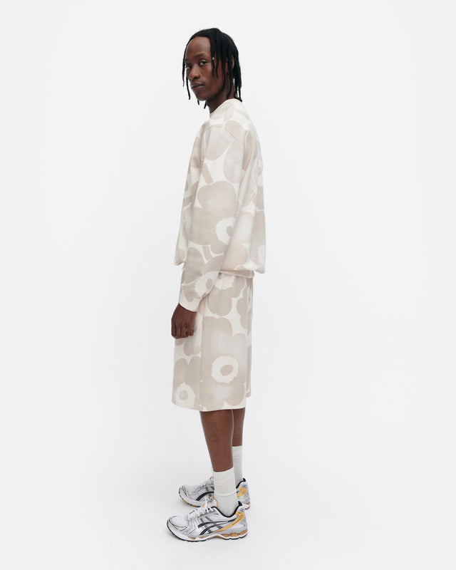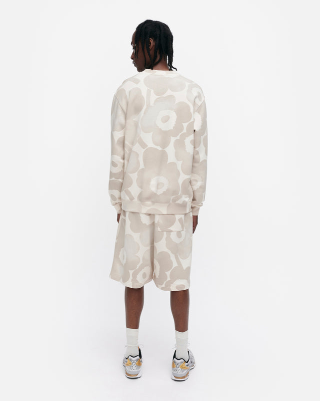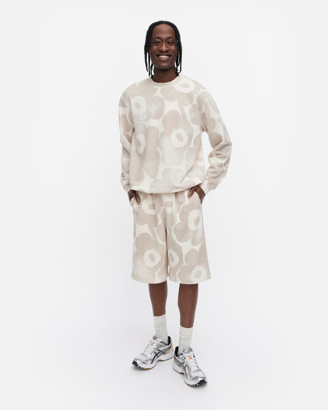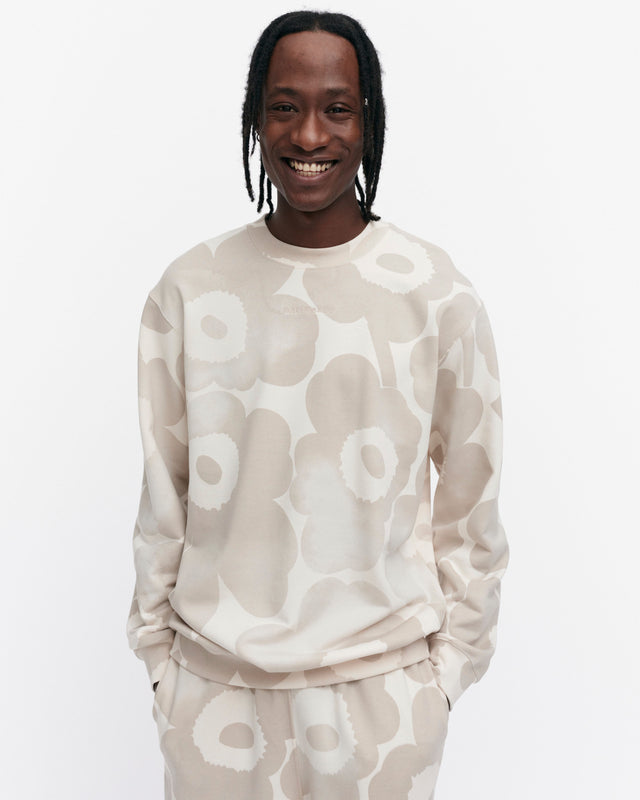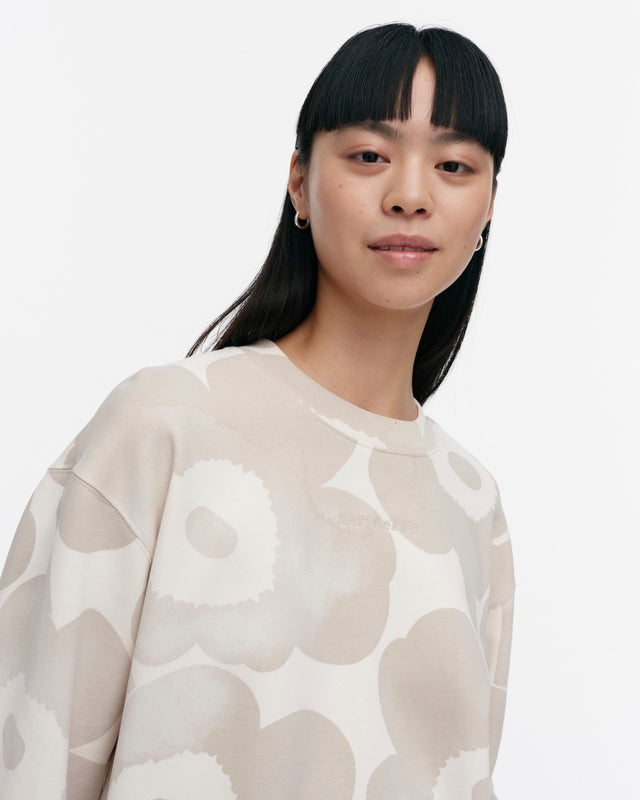 The Loisto sweatshirt is made of organic cotton French terry, and it has a straight, unisex fit. The sweatshirt features the the Akvarelli Unikko pattern, which looks like it was painted with watercolours. The color of the pattern varies with lighter and darker areas, making each product unique. Sweatshirt has the embroidered Marimekko logo in the front. The sweatshirt has a ribbed O-neck and wide ribbing at the sleeve ends and hemline.