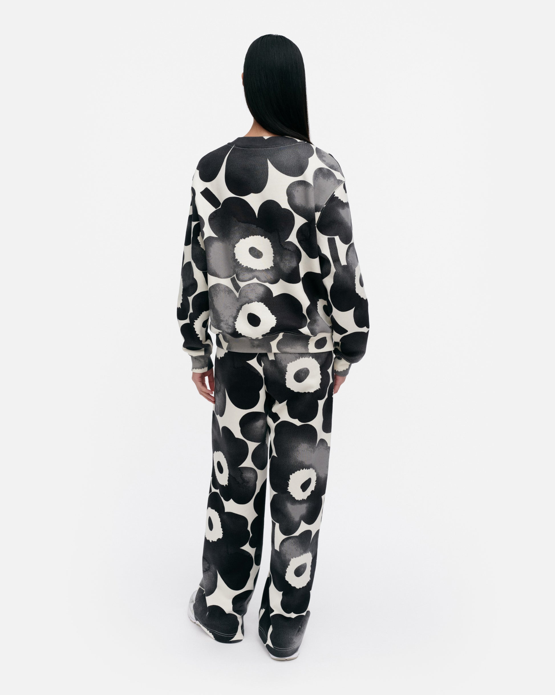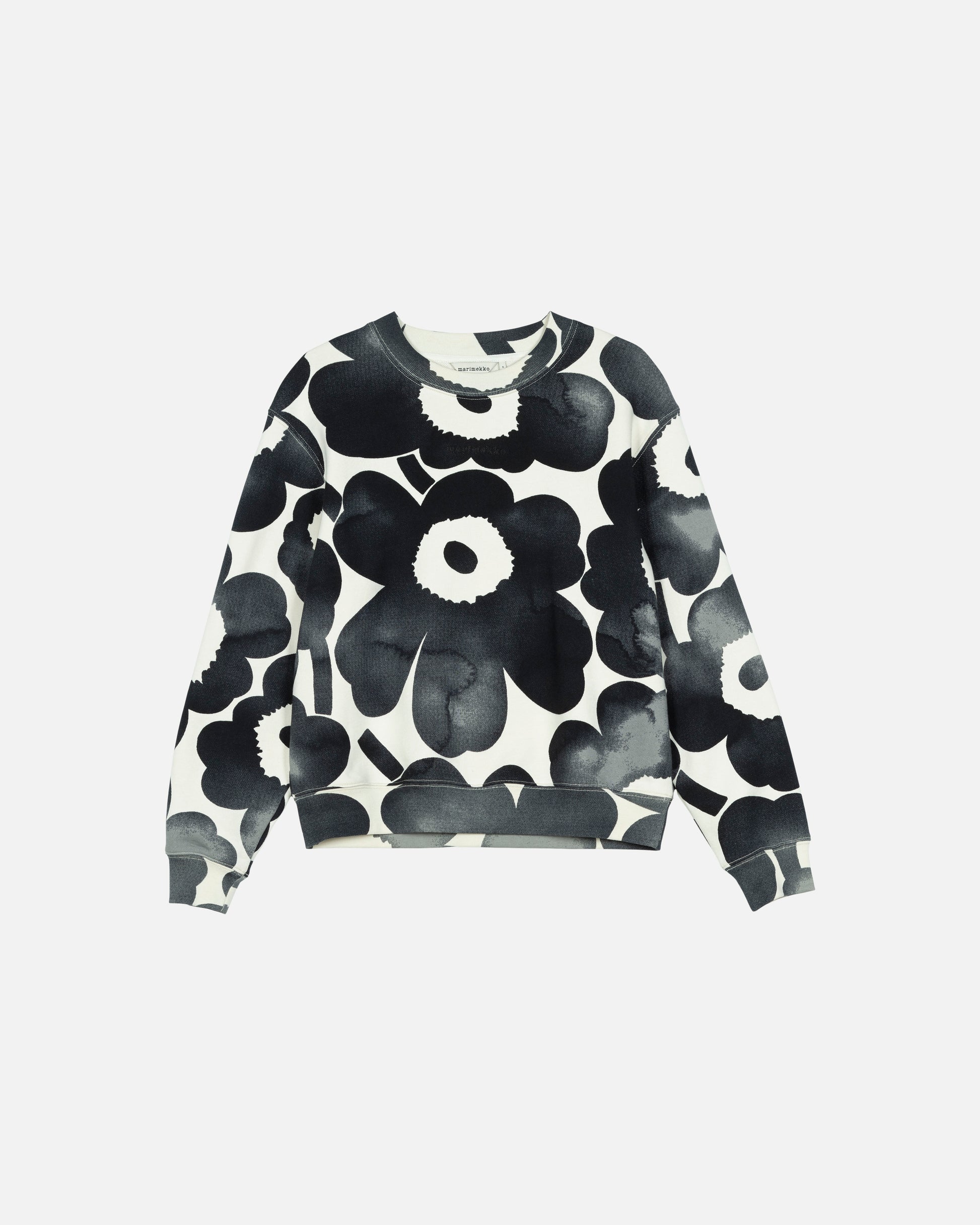 The Leiot sweatshirt is made of organic cotton French terry, and it has a relaxed fit. The sweatshirt features the Akvarelli Unikko pattern, which looks like it was painted with watercolours. Sweatshirt has the embroidered Marimekko logo in the front. The sweatshirt has a ribbed O-neck and wide ribbing at the sleeve ends and hemline. br/>