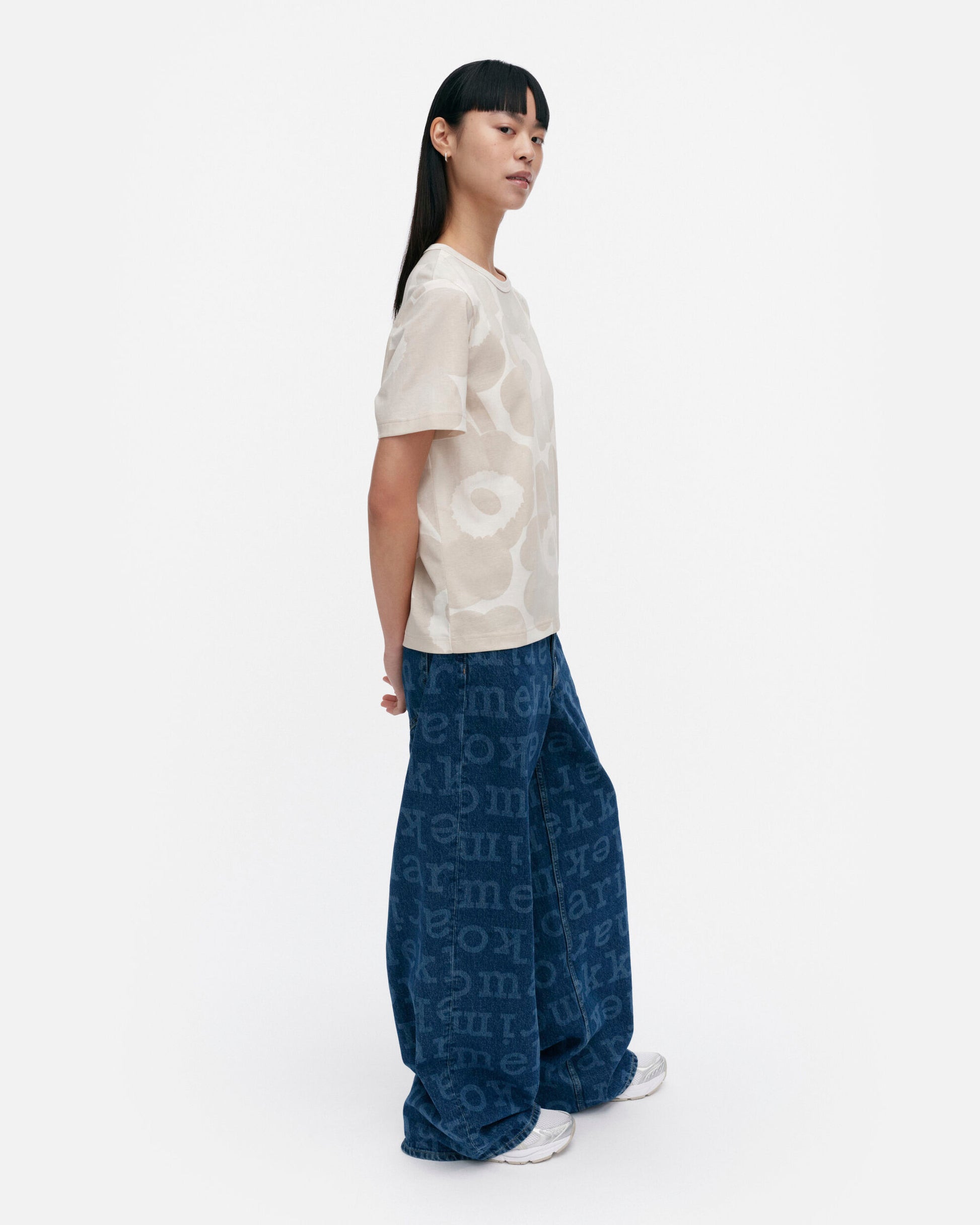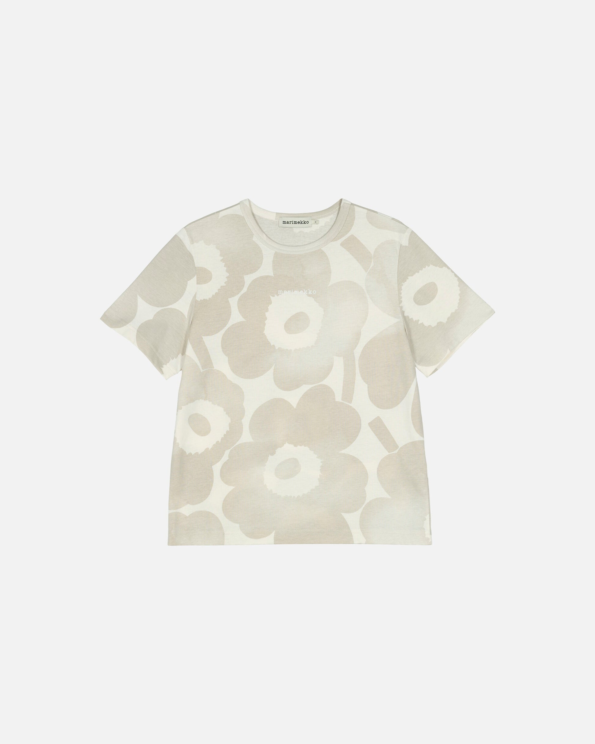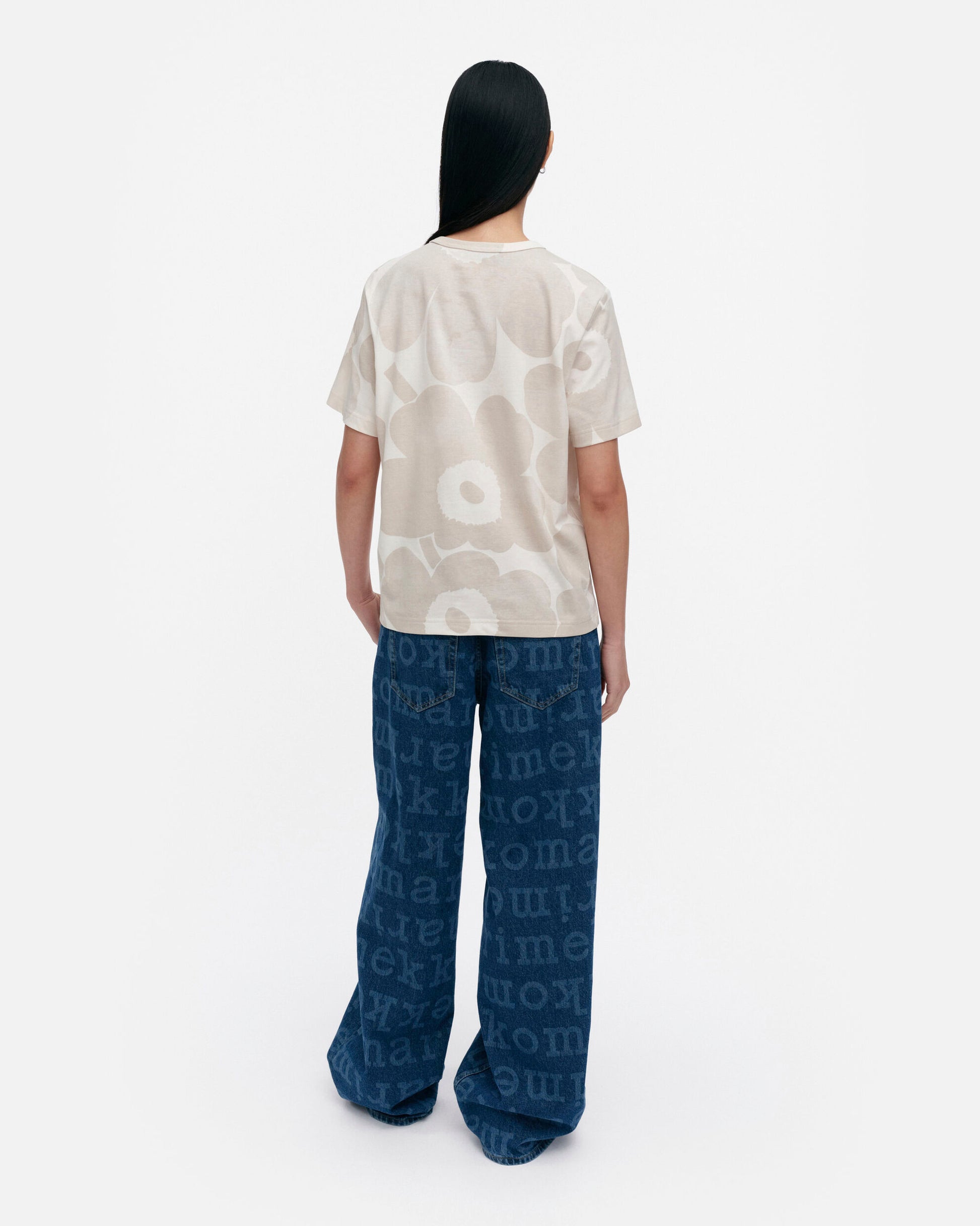 The Erna t-shirt is made of organic cotton jersey, and it has a relaxed fit. The shirt has the Akvarelli Unikko pattern, which looks like it was painted with watercolours. The color of the pattern varies with lighter and darker areas, making each product unique. The t-shirt has a ribbed O-neck.