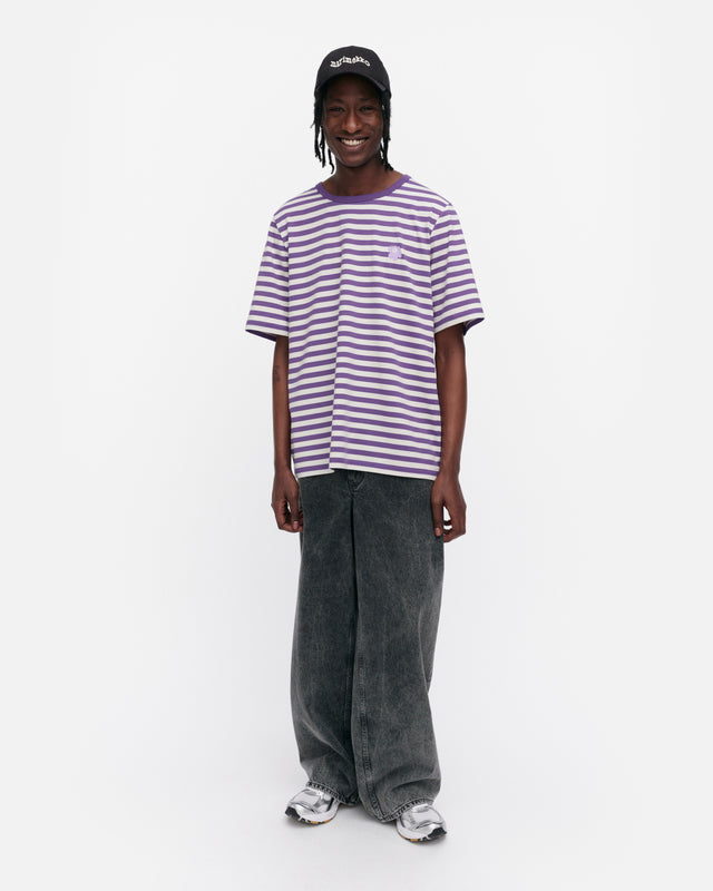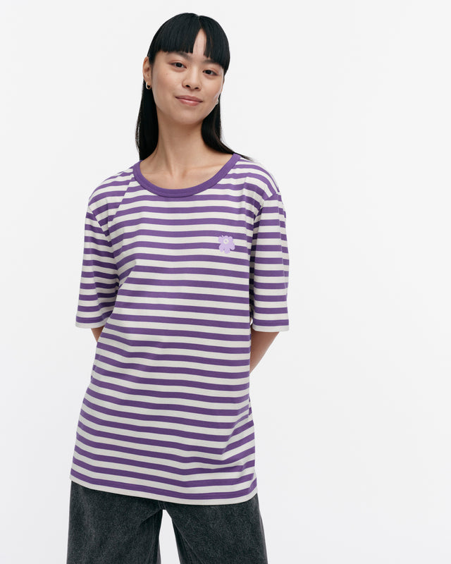 The unisex fit t-shirt is made of organic cotton jersey, and it features the Tasaraita pattern as well as the small Unikko flower, which is printed in the front. The t-shirt has a ribbed O-neck.
