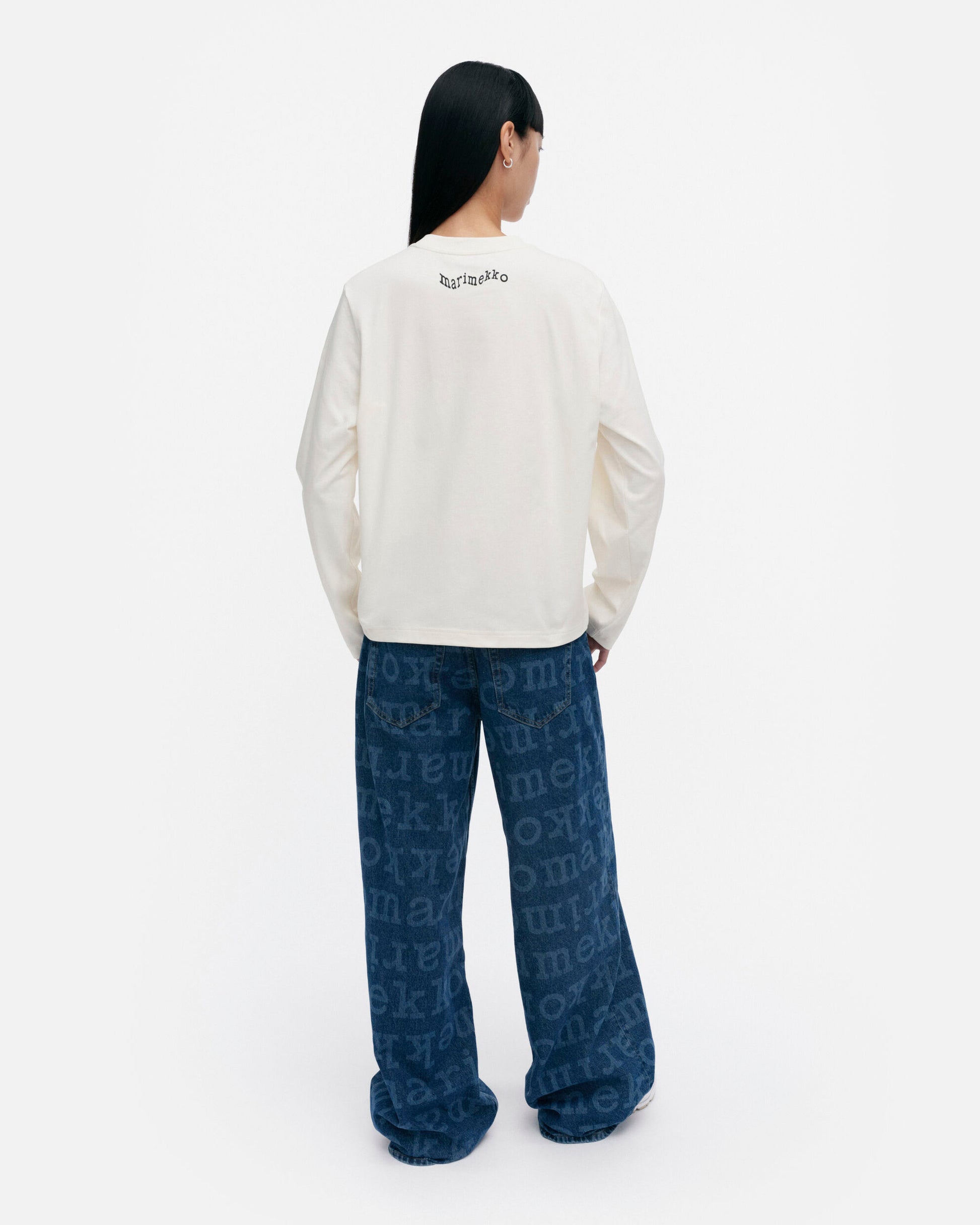 The Elve longsleeve jersey shirt is made of organic cotton, and it has a relaxed fit. The shirt has the Akvarelli Unikko pattern, which looks like it was painted with watercolours. The t-shirt has a ribbed O-neck. Shirt has printed wavy Logo text on the top of on backside.