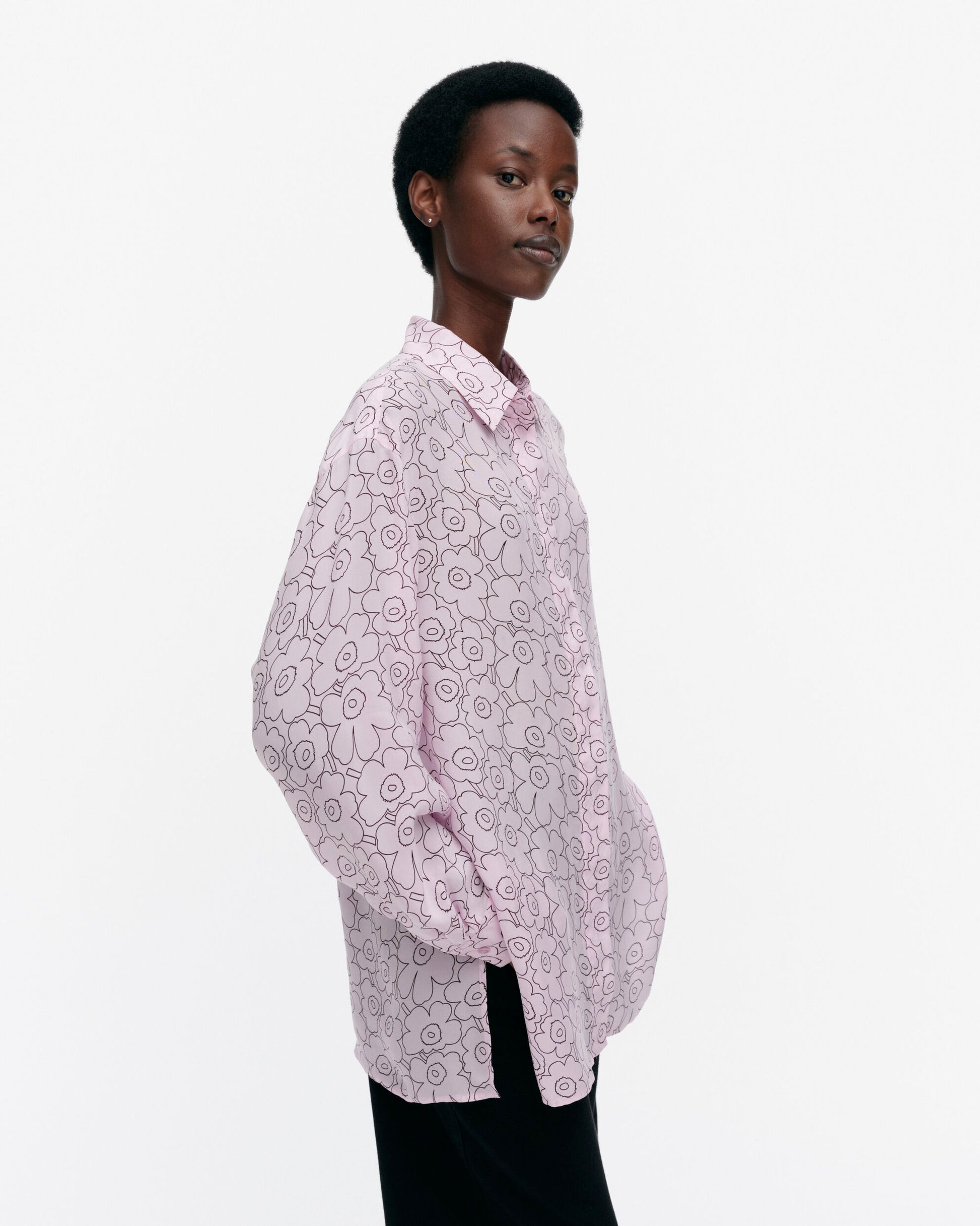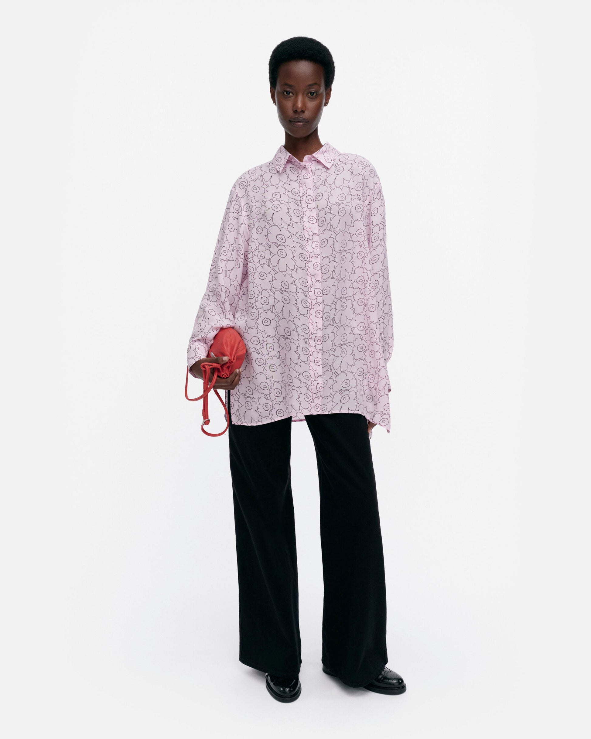 The Runsas button-up cupro shirt has an oversized, straight fit and it features the Piirto Unikko pattern. The shirt has a concealed button closure, and a back yoke seam with pleats. The cuffed sleeves have button closures. The hem features side slits and it is slightly longer in the back than in the front.