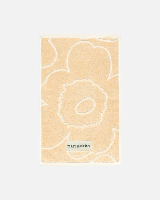 This hand towel is made of heavyweight organic cotton terry. The towel features the debossed Piirto Unikko pattern on one side and the Marimekko label on the bottom edge.