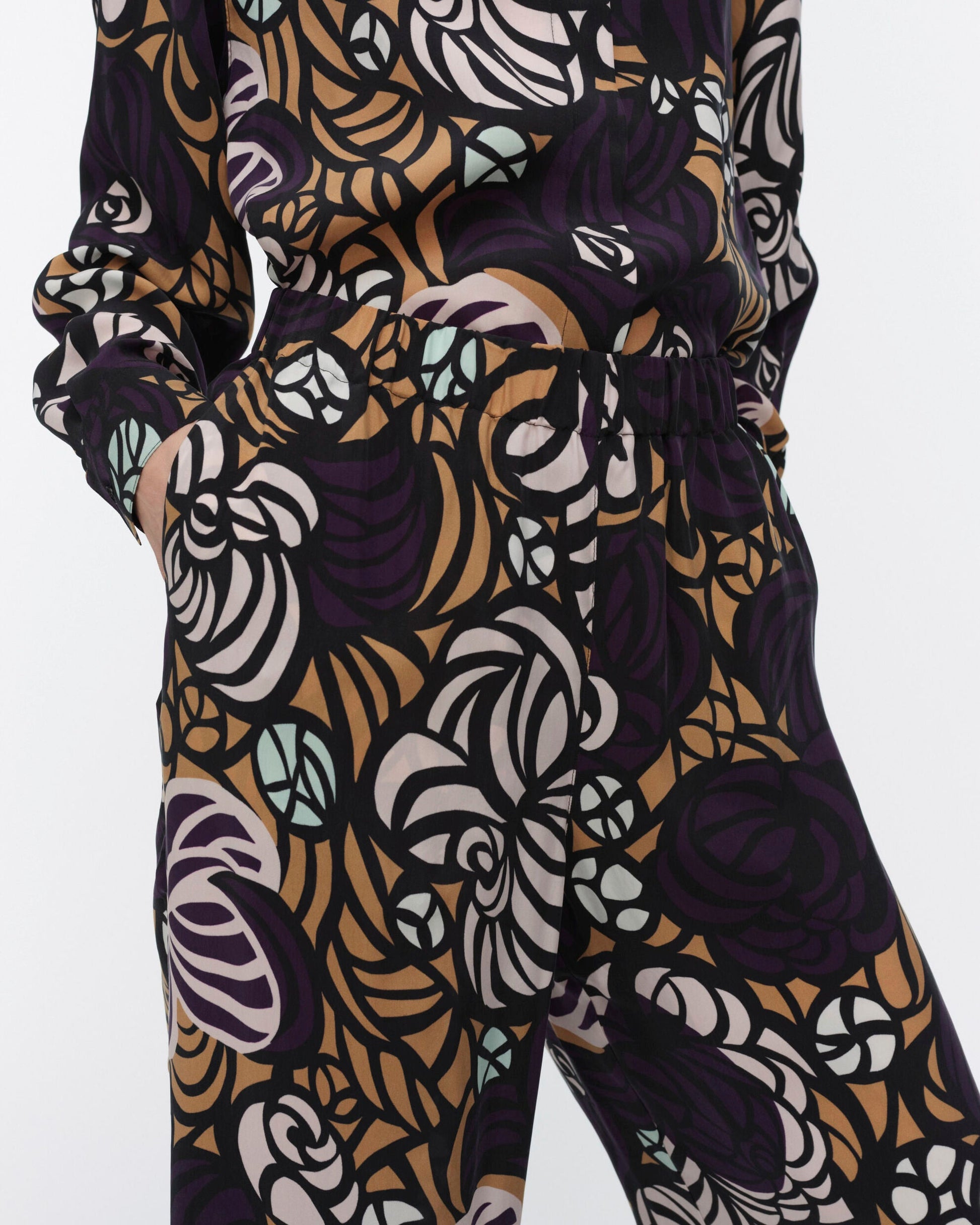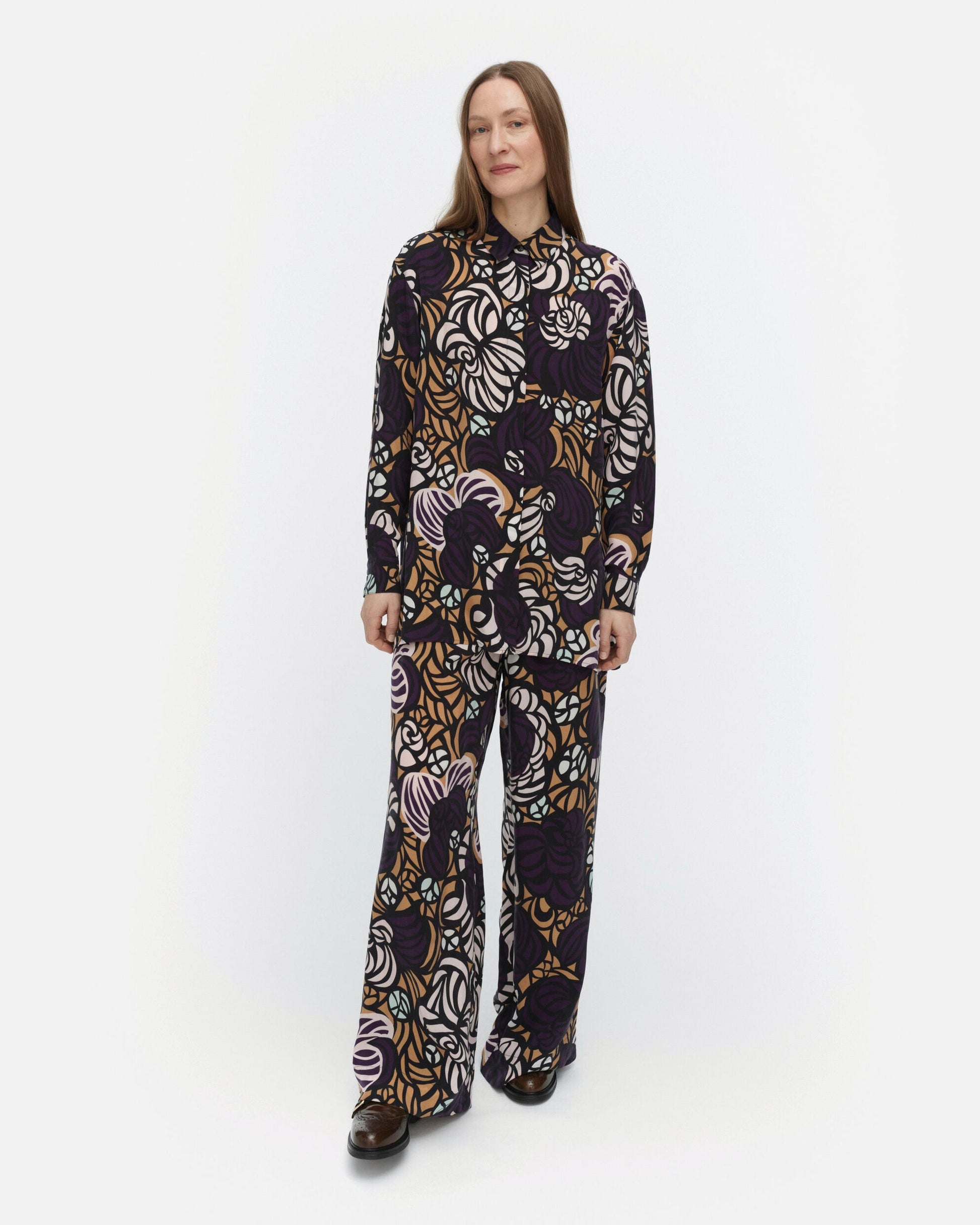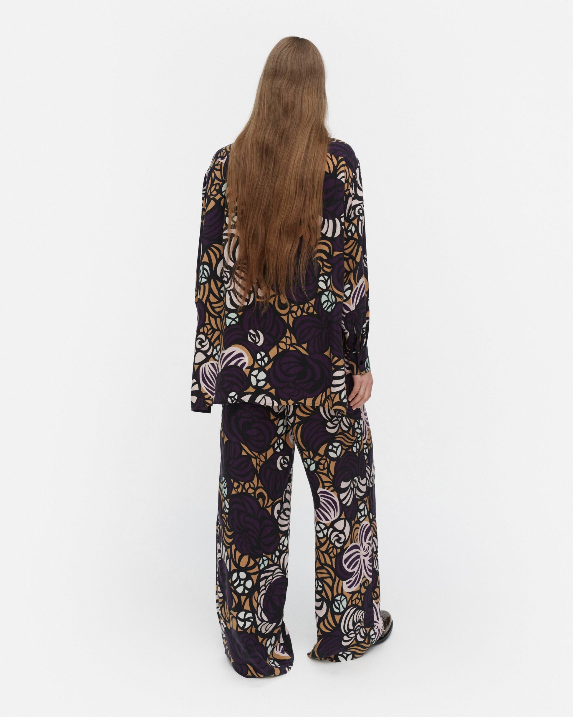 The Oanet cupro trousers have a relaxed fit and long, wide trouser legs, and they feature the Torstai pattern. The trousers have an elastic waistband and side seam pockets.The cupro in this product is made from by-products of cotton production.Designed by Paavo Halonen, the Torstai (Thursday) print is an outpouring of profusion, a luscious wild garden with peonies and roses. Colors and details were added through the design process, and the result is a pattern that almost smells like flower fields.
