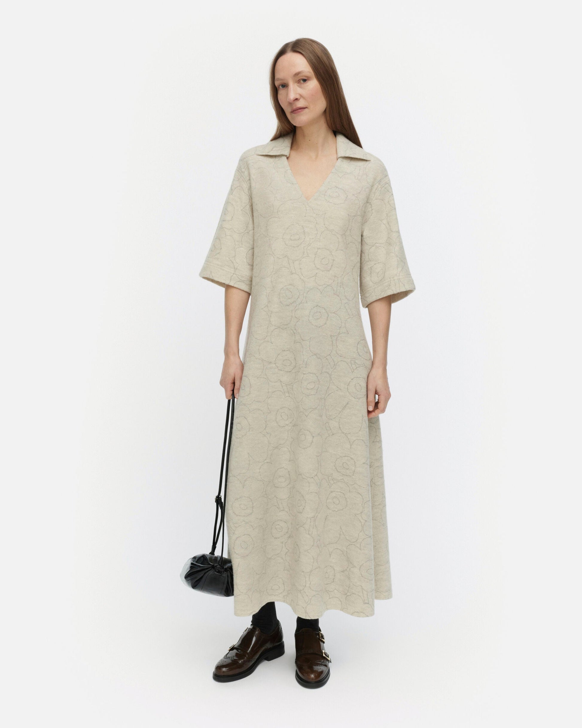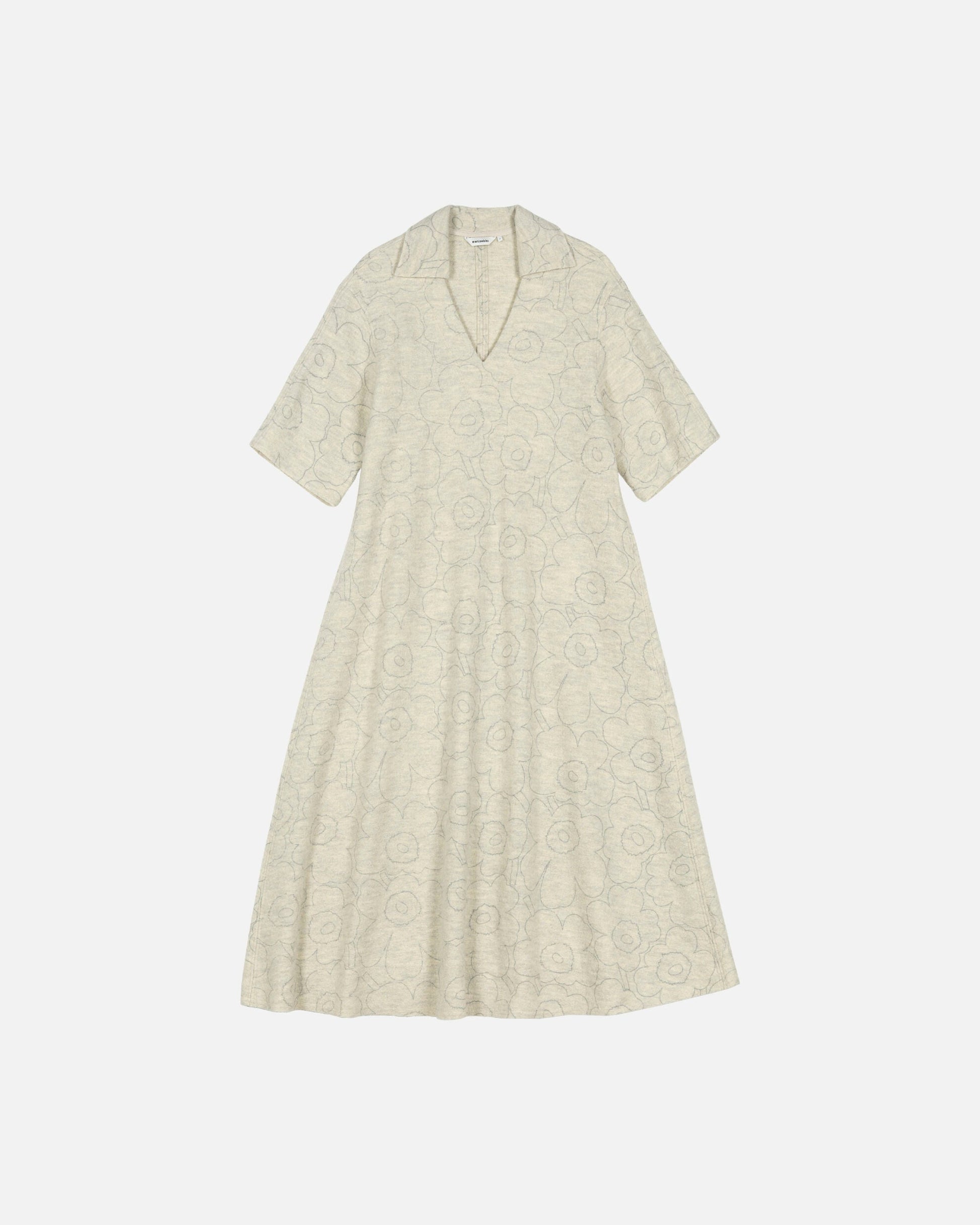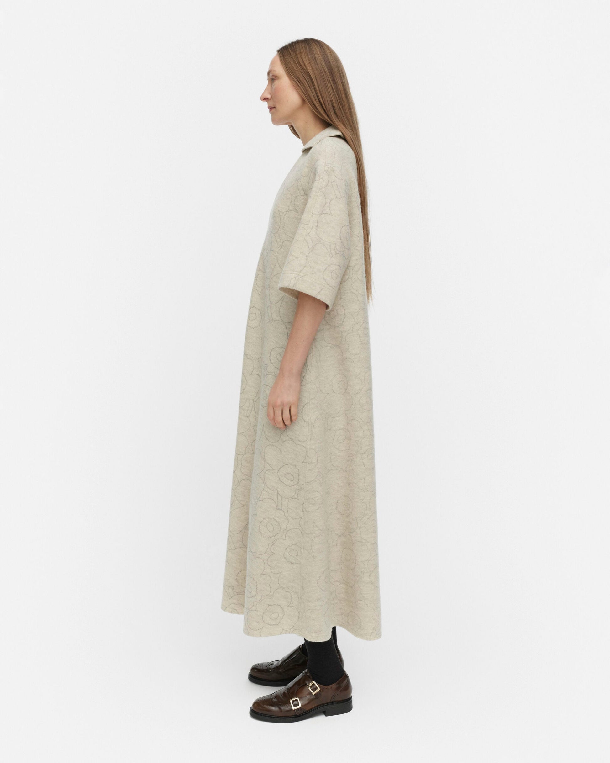 The Nietos wool dress has a relaxed, A-line fit and it features the Piirto Unikko pattern. The dress has a wide collar with a front V-neck and elbow-length sleeves with wide turn-ups at the cuffs. There is a central seam in the back and the hem has a raw-edge finished with topstitching.