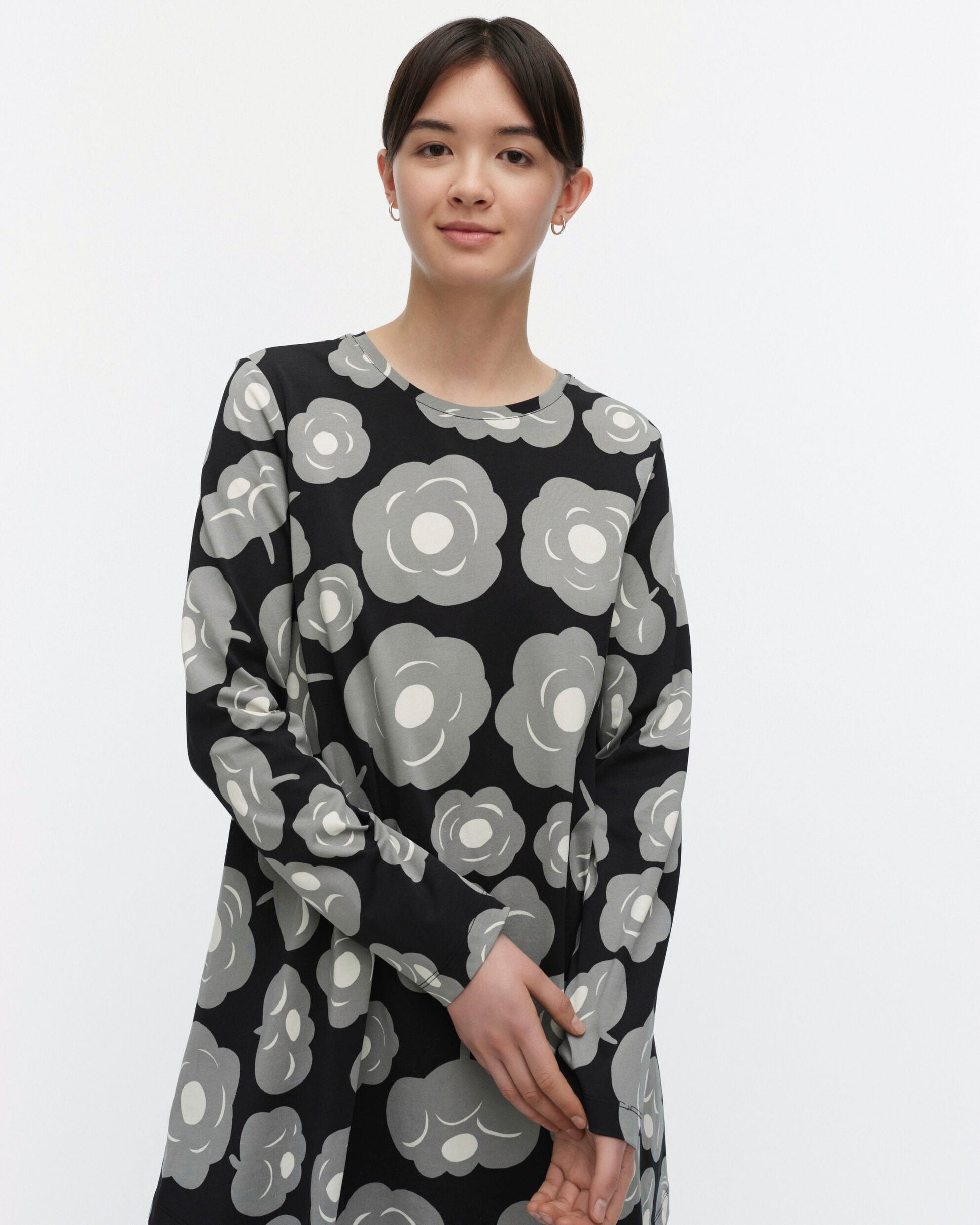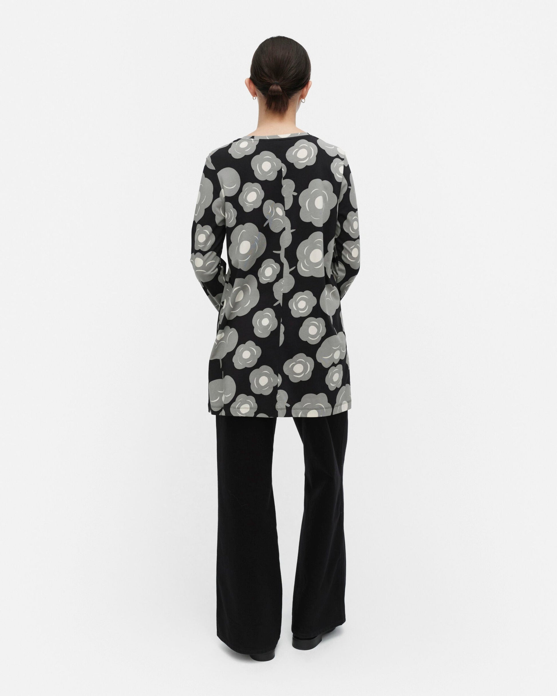 The Kevät tunic is made of organic cotton jersey, and it has a slim, A-line fit. The tunic is printed in the Tumma pattern, and it has an O-neck with an own jersey and long sleeves.Maija Isola was greatly inspired by her countless travels around the world. In 1970, she created the bold floral pattern Tumma (dark) as a souvenir of her long trip to Paris.