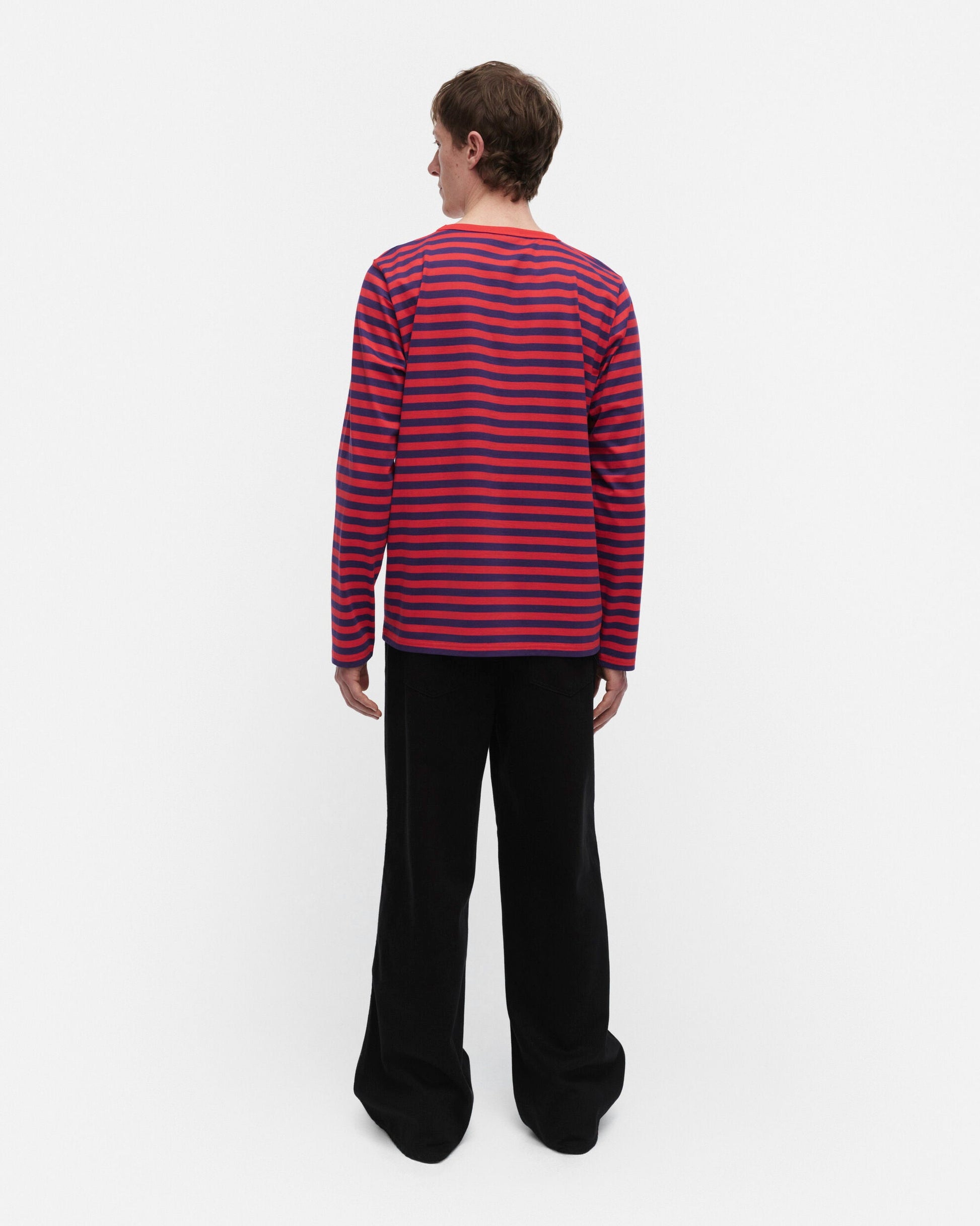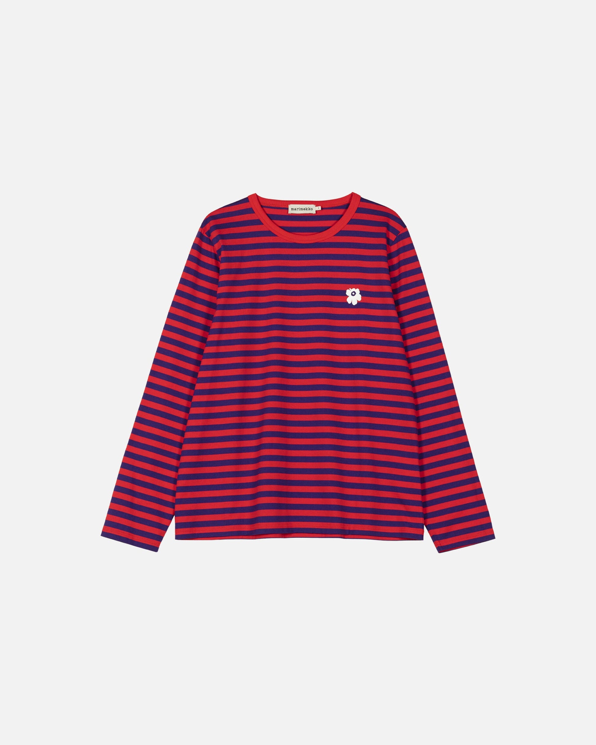 The unisex fit jersey shirt is made of organic cotton jersey, and it features the Tasaraita pattern as well as the small Unikko flower, which is printed in the front. The longsleeved jerseys shirt has a ribbed O-neck.