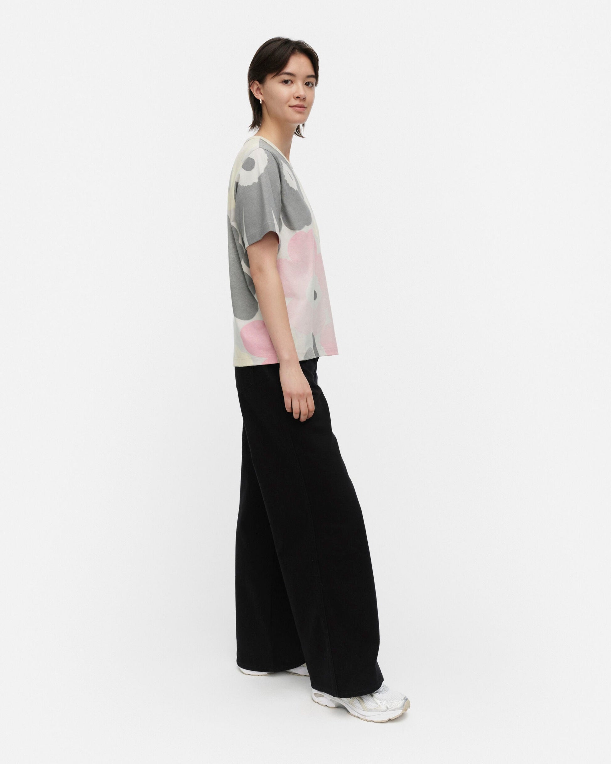 The Erna t-shirt has a relaxed fit. The t-shirt features the Unikko pattern, which looks like it was painted with watercolours. The t-shirt has a ribbed O-neck.