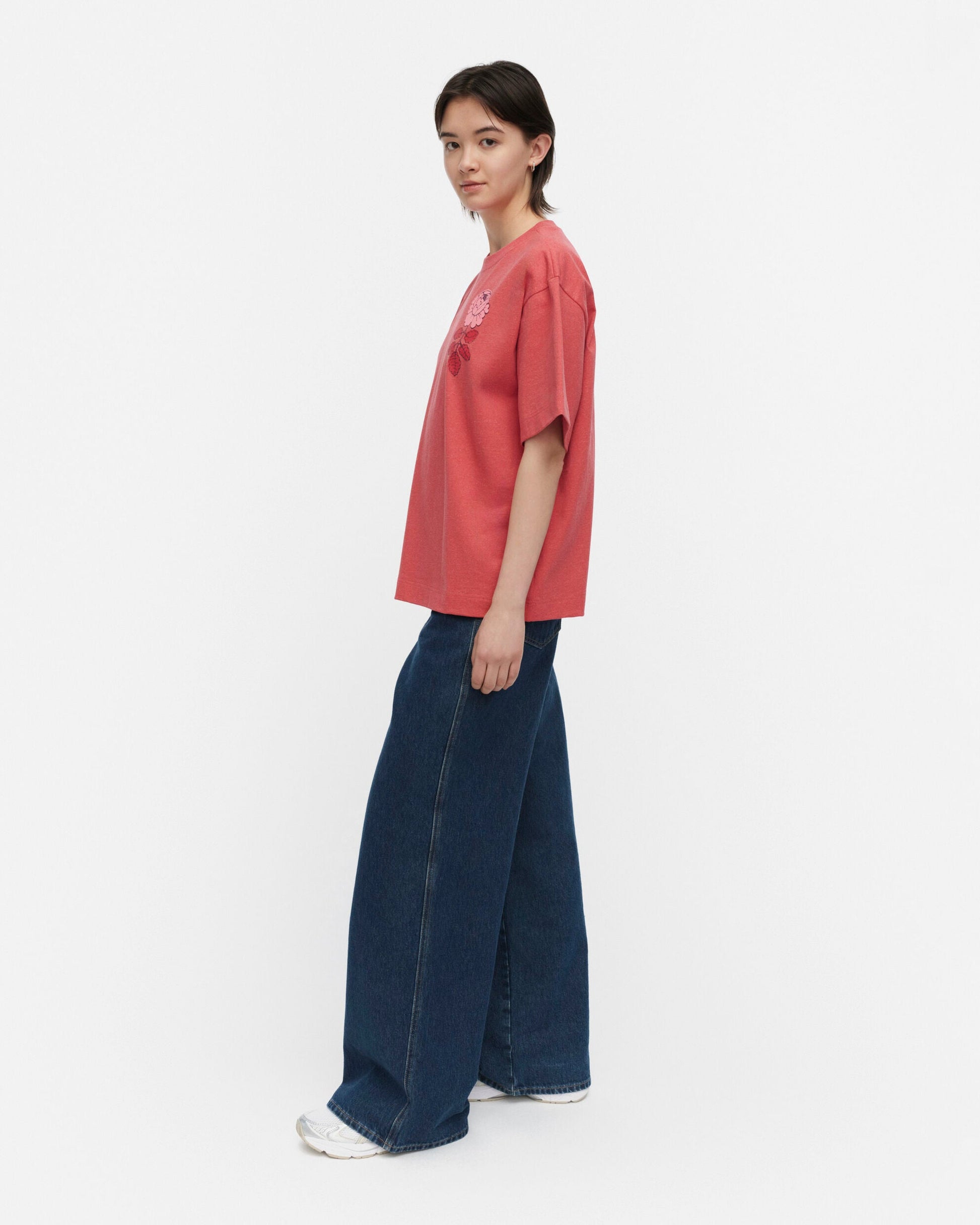 {"type":"root","children":[{"type":"paragraph","children":[{"type":"text","value":"The mélange red Risut t-shirt has an oversized fit and it features the printed Vihkiruusu flower in the front. The t-shirt has an O-neck with wide ribbing.This product is made of cotton jersey, which contains 70% organic cotton and 30% recycled cotton. The recycled fibers originate from a closed loop production, where textile waste generated in the manufacturing of Marimekko’s collections is used as raw material for new Marimekko products. Vihkiruusu (wedding rose) was born in a time when hardly any floral designs were included in Marimekko’s collections. Maija Isola, however, was fascinated by the theme of flowers and decided to create an entire range of novel floral prints. The iconic Unikko was one of the designs in that range along with Vihkiruusu."}]}]}
