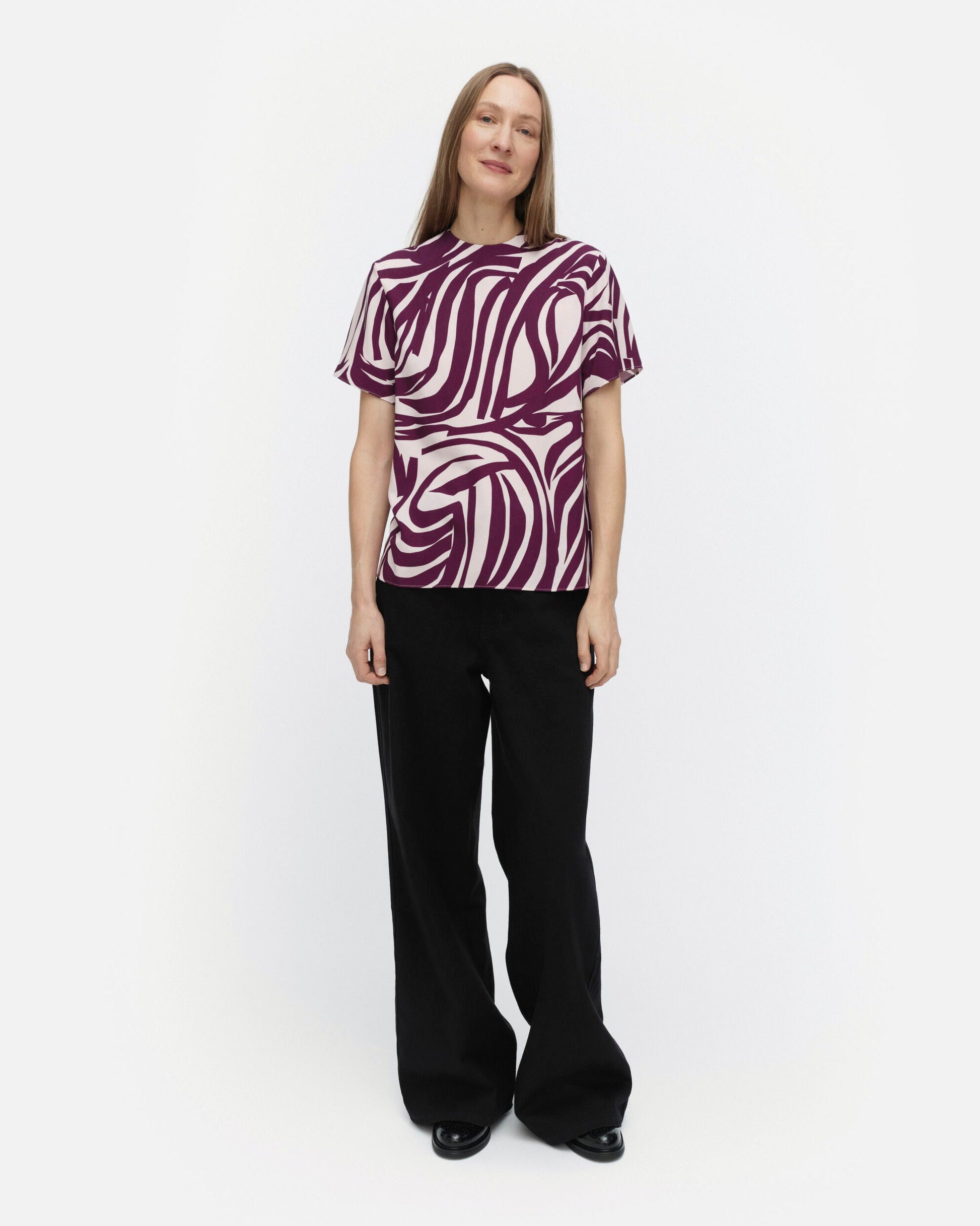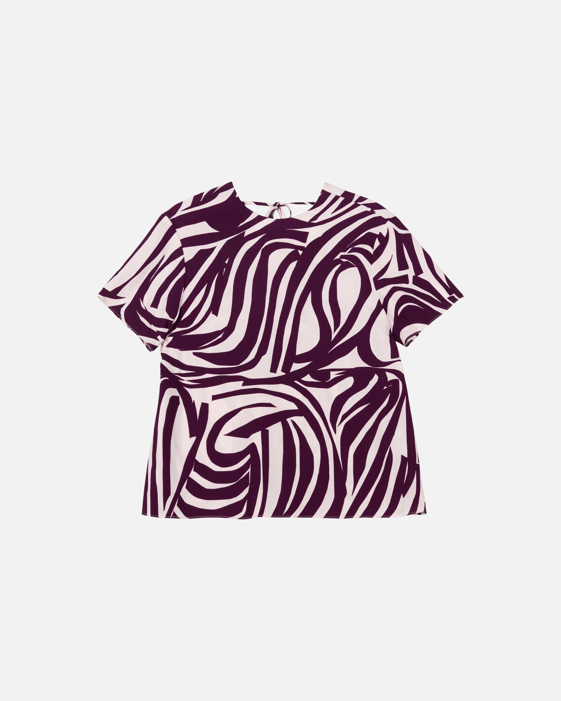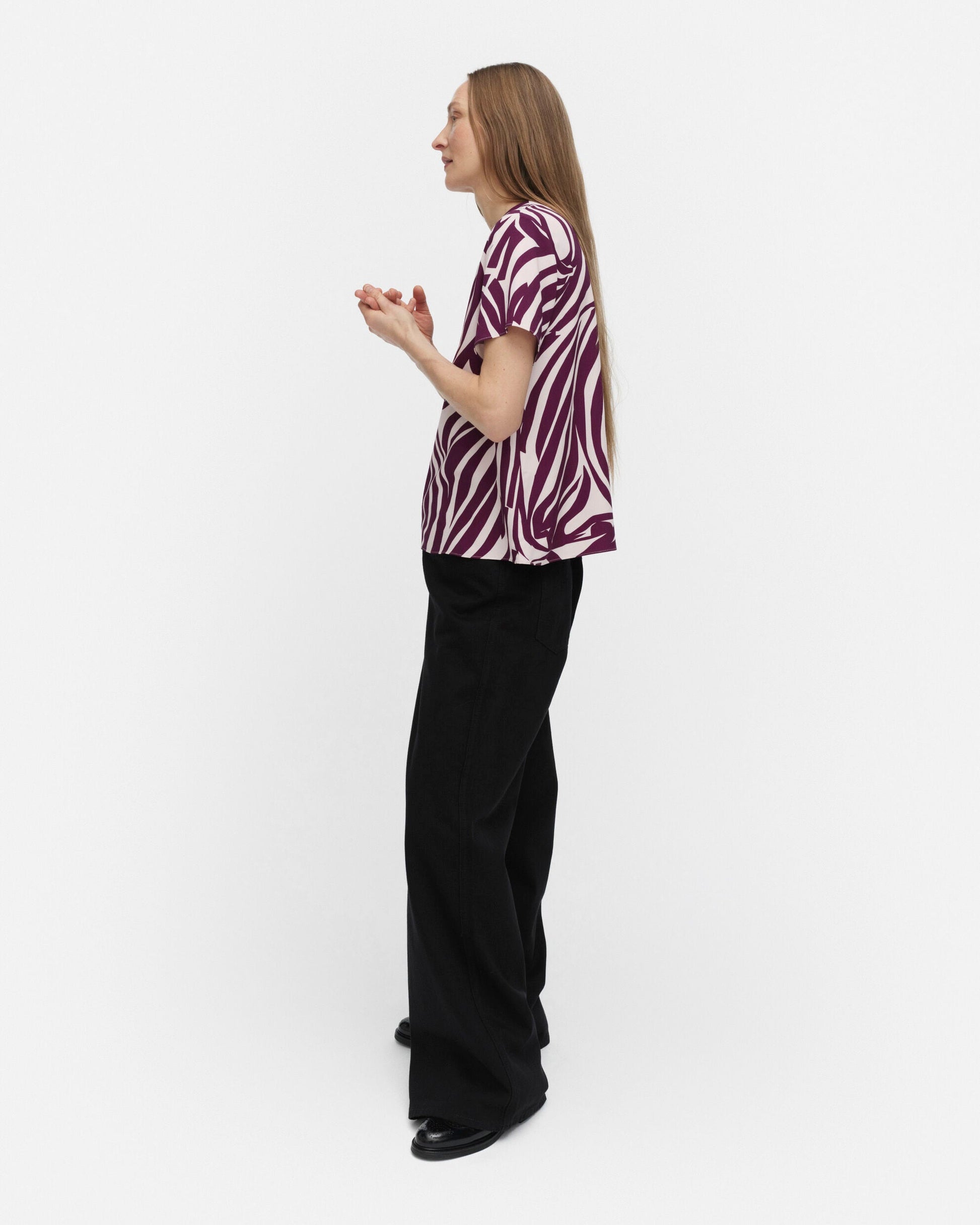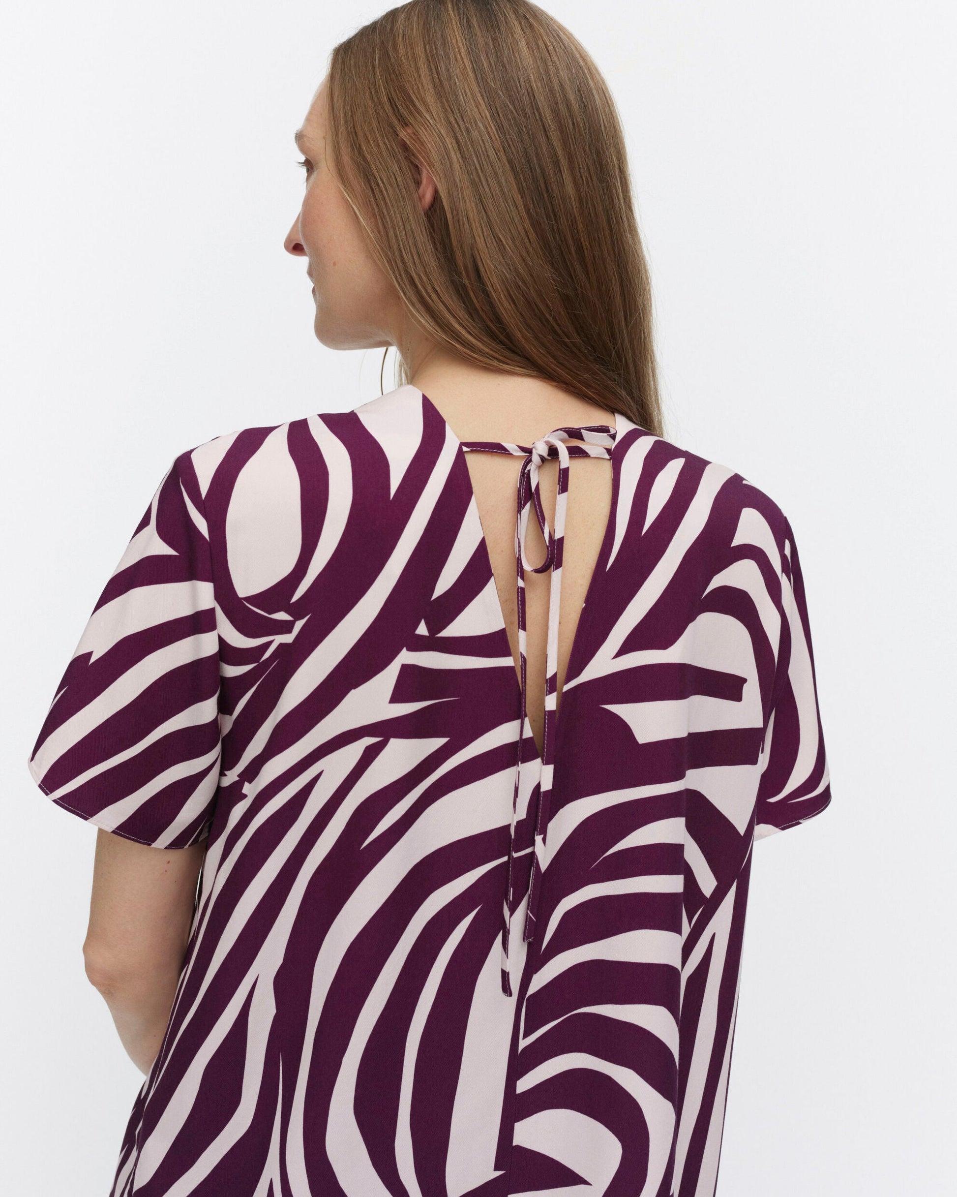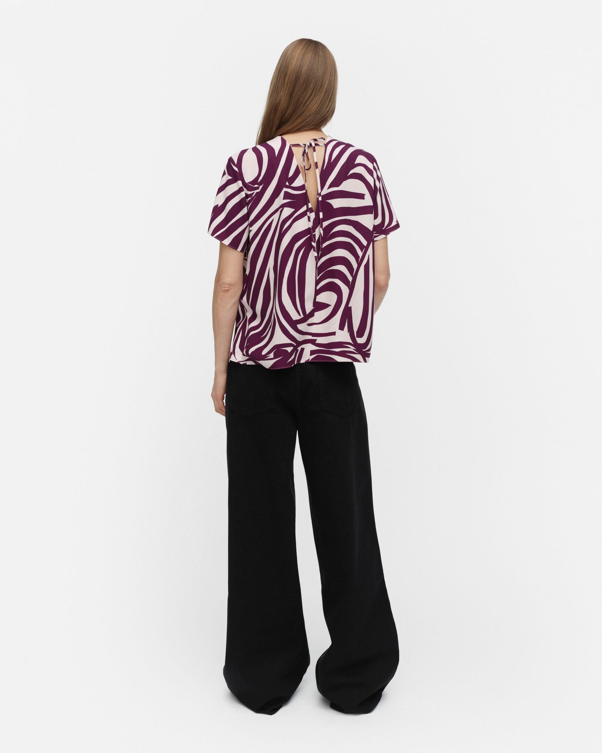 The Hilja blouse has a slim, straight fit, and it features the Jokuraita pattern. The short-sleeved blouse has an O-neck in the front and a V-slit and ribbon closure in the back neckline.This product is made of viscose. The main material contains at least 30% CIRCULOSE® fibers recycled from textile waste. The color and surface will soften with washing and use.The Jokuraita (some stripe) design by Antti Kalevi started as a spontaneous drawing inspired by zebra patterns. The relaxed and rough execution of the design beautifully exemplifies how the best results are often achieved when you don’t try too hard.