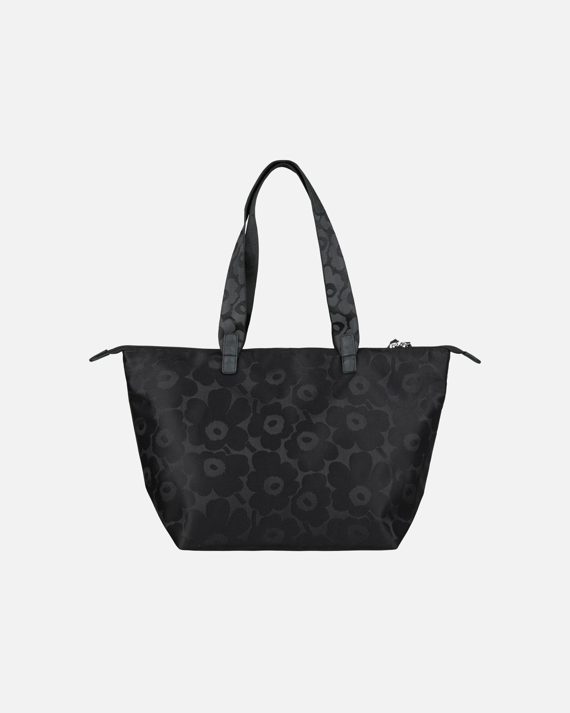 The Tote M shoulder bag features the jacquard knit Unikko pattern. The spacious bag has a zipper closure and handles, and it can fit a laptop inside. The inside is lined, and it has one slip-in pocket. The front features the Marimekko logo label and the Marimekko keystrap that is attached with a D-ring.