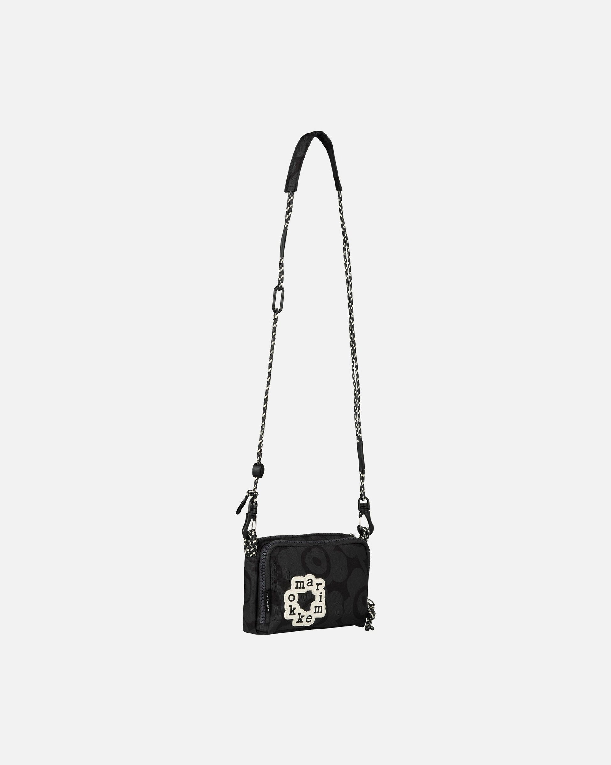 The Iloisa shoulder bag features the Mini Unikko pattern. The bag has two different compartments, both with zipper openings and cord pullers. The front compartment features a mesh pocket on the inside. The bag has a cord shoulder strap with a thin pad on the shoulder area for added comfort. The shoulder strap is removable and can be adjusted with a stopper. The circular Marimekko logo patch sewn on the front is made of recycled silicone.