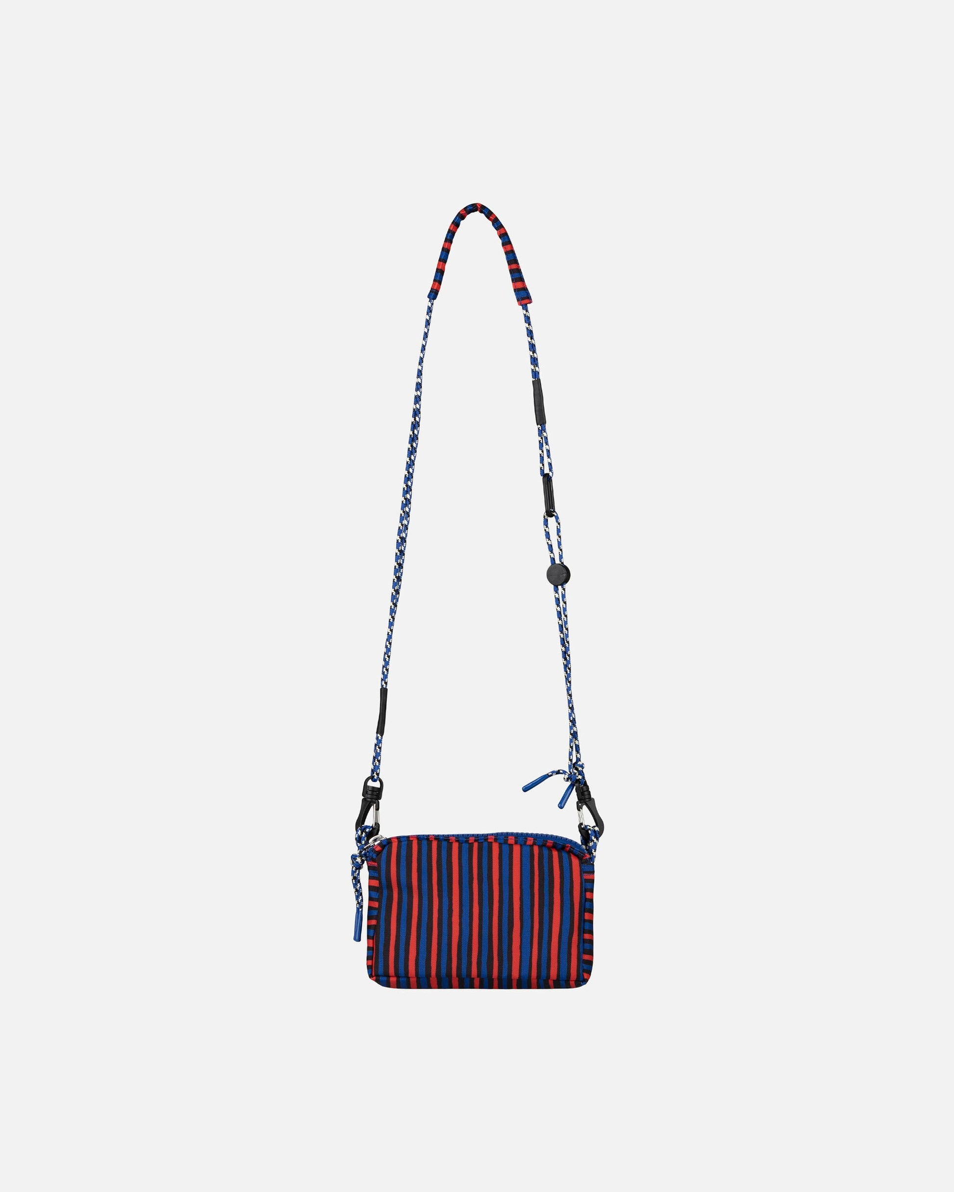 The Iloisa shoulder bag features the Mini Unikko pattern. The bag has two different compartments, both with zipper openings and cord pullers. The front compartment features a mesh pocket on the inside. The bag has a cord shoulder strap with a thin pad on the shoulder area for added comfort. The shoulder strap is removable and can be adjusted with a stopper. The circular Marimekko logo patch sewn on the front is made of recycled silicone.