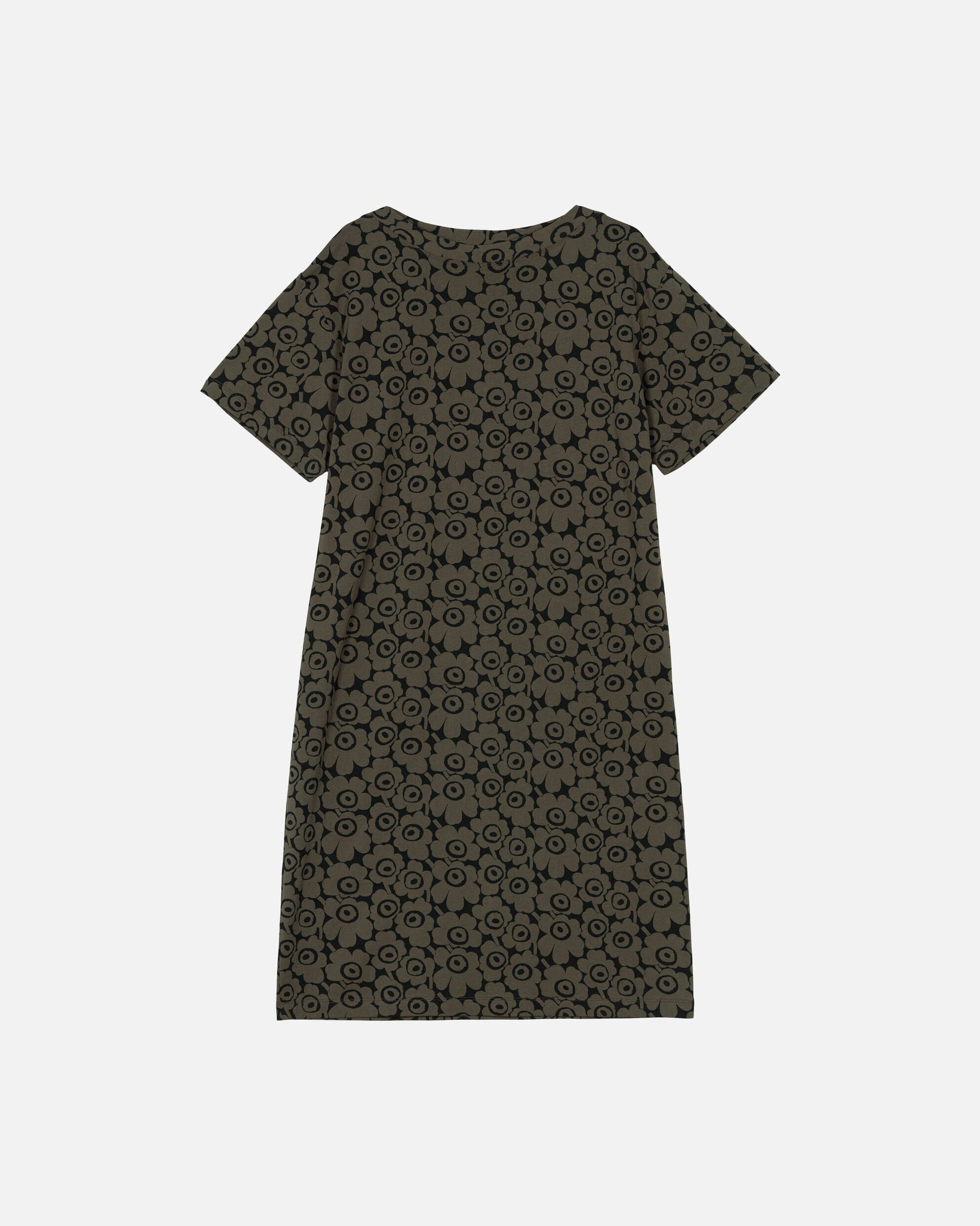 The Joku dress has an oversized, straight fit. The dress features the Unikko pattern, a ribbed boatneck, and short, loose sleeves that are dropped at the shoulders.