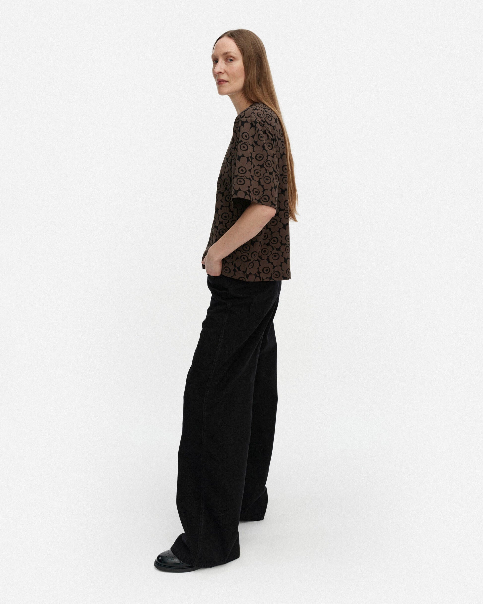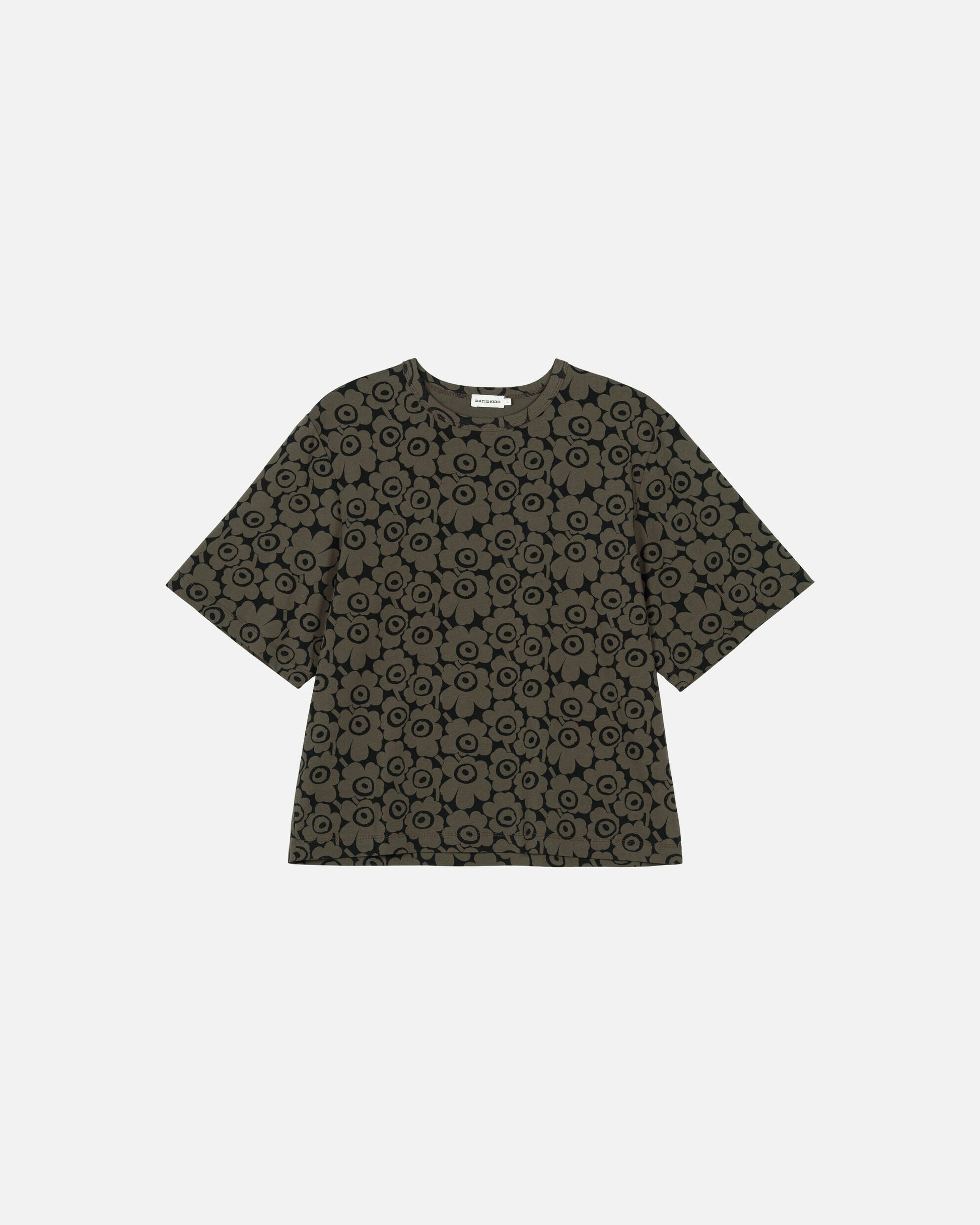 The Juulia t-shirt has an oversized, straight fit. The t-shirt features the Unikko pattern, a ribbed O-neck, and short, loose sleeves that are dropped at the shoulders.
