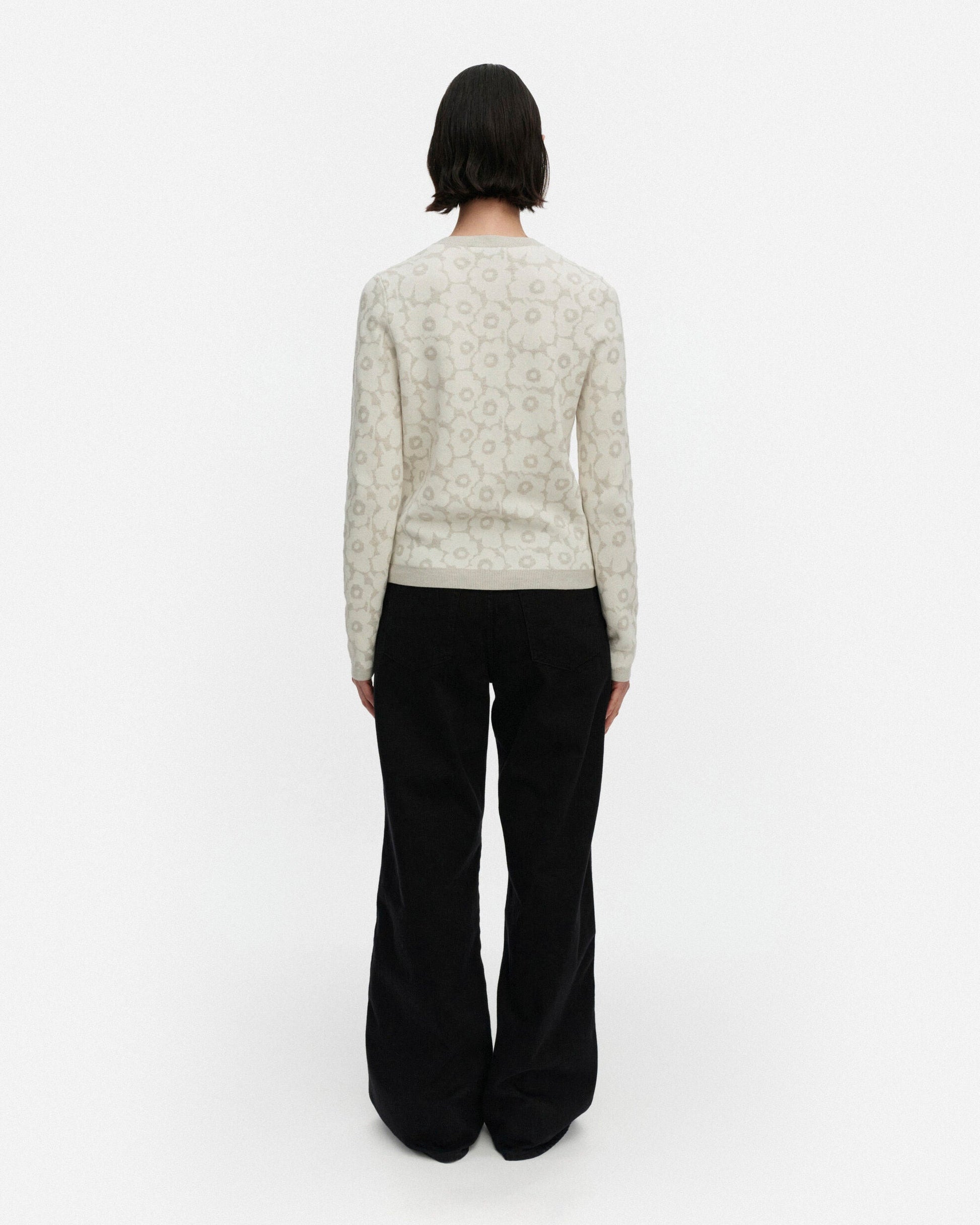 The knitted cardigan is made of a merino wool and cotton blend. This product contains 51% organic cotton, 47% certified merino wool, and 2% polyamide. The product contains RWS certified wool, Certified by Control Union 898864. The Responsible Wool Standard (RWS) describes and certifies animal welfare and land management practices in wool production and tracks the certified material from farm to final product. In addition, the wool can be traced to farms that implement regenerative principles.