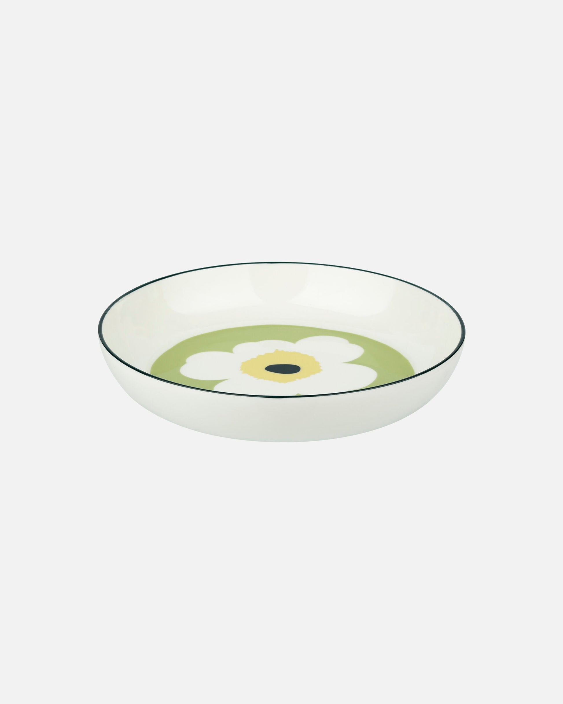 The deep Oiva plate with Unikko pattern is dishwasher, oven, microwave, and freezer safe.