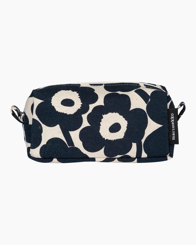 The Tiise cosmetic bag is made of an unbleached cotton and linen blend with a stain-repellent finish on the outside. The bag has a zipper closure and a nylon lining on the inside. The dark blue Mini Unikko pattern is printed in Helsinki.