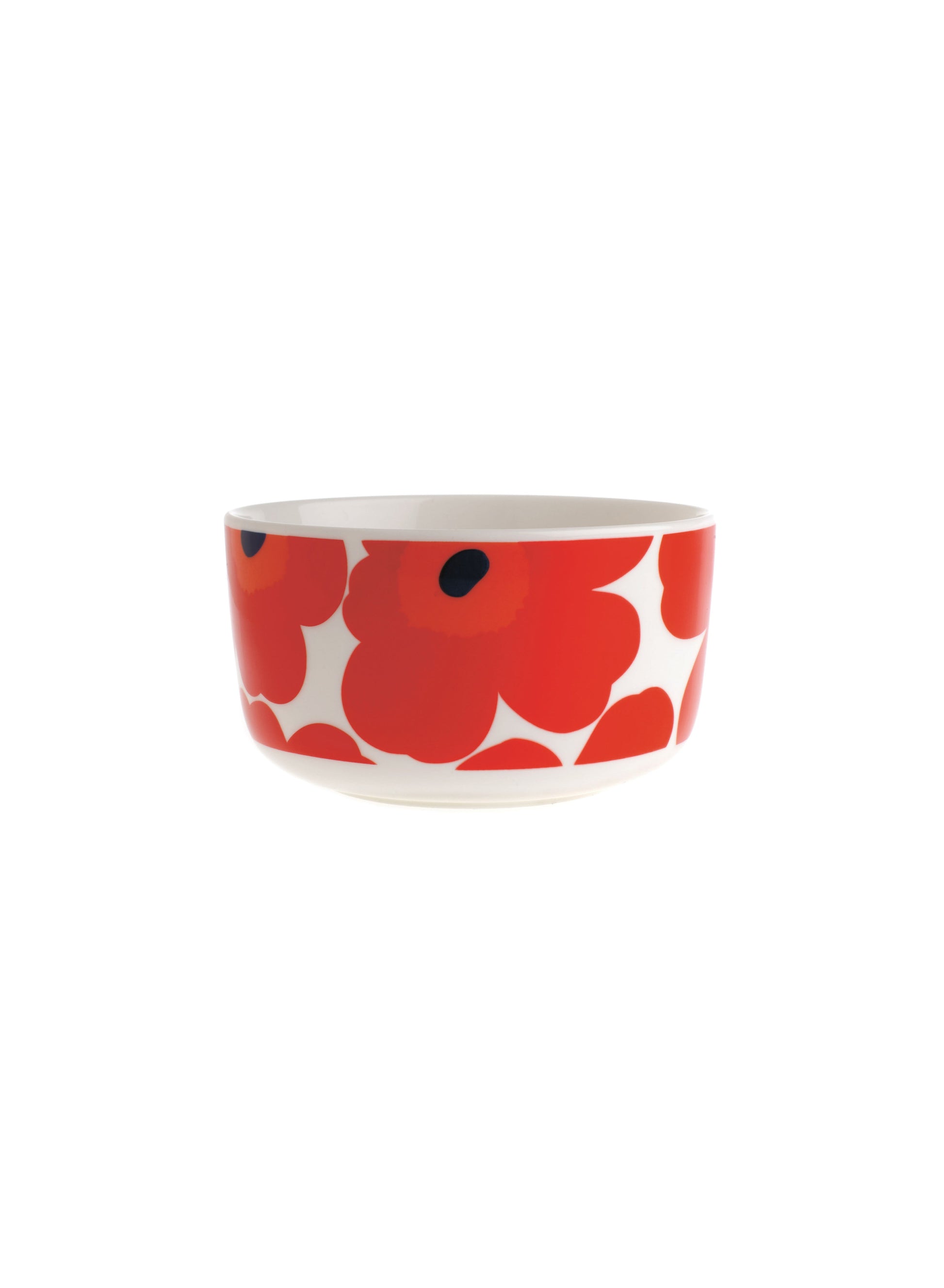 This bowl is decorated with the classic red Unikko pattern. The bowl is made of dishwasher, oven, microwave and freezer proof white stoneware.
