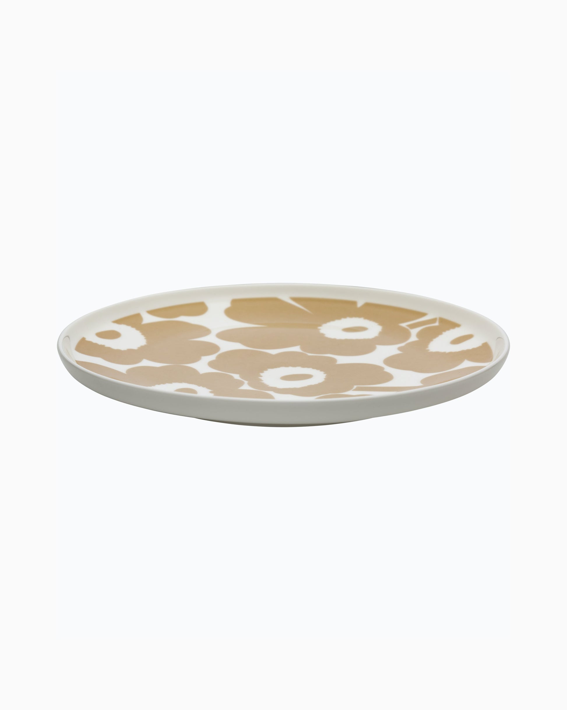 The Oiva plate features the Unikko pattern and it is made of dishwasher, oven, microwave and freezer safe white stoneware.