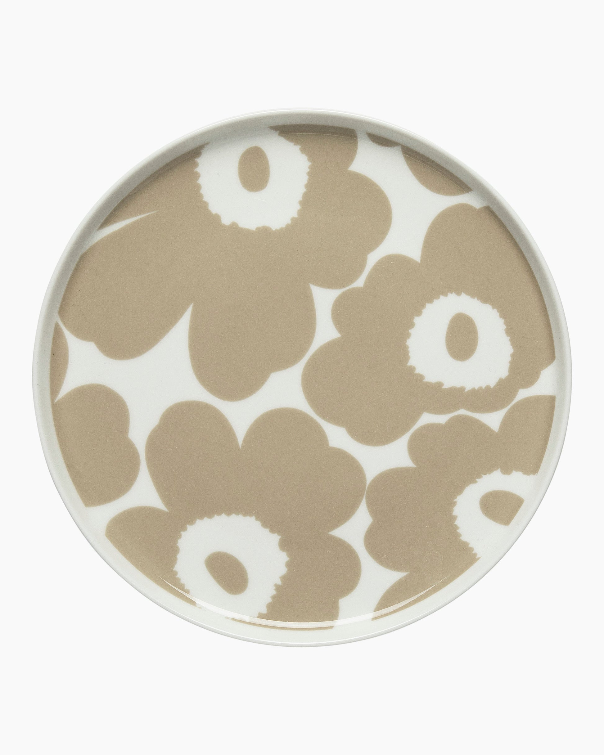 The Oiva plate features the white and beige Unikko (poppy) pattern and it is made of dishwasher, oven, microwave and freezer safe white stoneware.