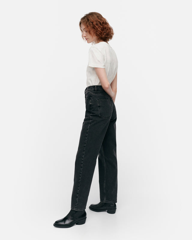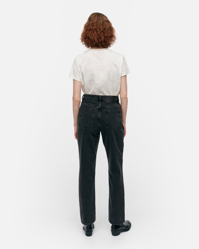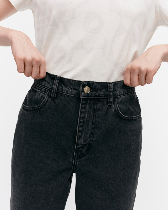 The washed black Maridenim Straight jeans are made of non-stretch cotton denim. The classic 5-pocket jeans have a high, fitted waist and straight, full-length legs. The jeans have Marimekko jean buttons and the Marimekko jean label in the back.