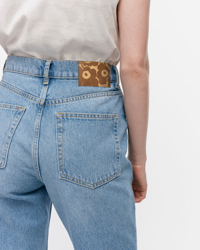 The washed light indigo Maridenim Straight jeans are made of non-stretch cotton denim. The classic 5-pocket jeans have a high, fitted waist and straight, full-length legs. The jeans have Marimekko jean buttons and the Marimekko jean label in the back.