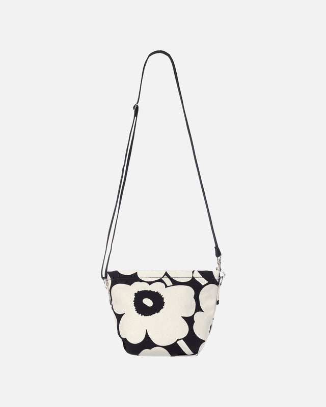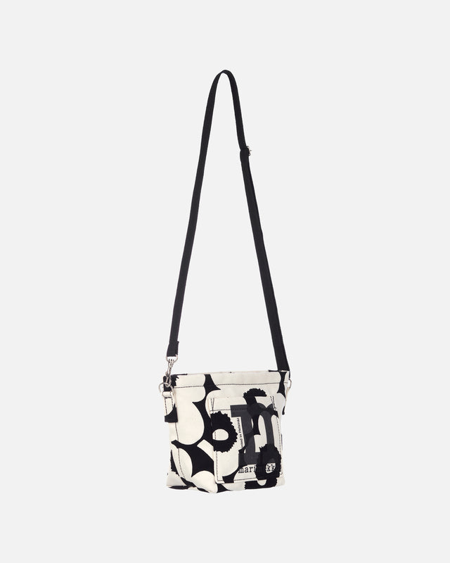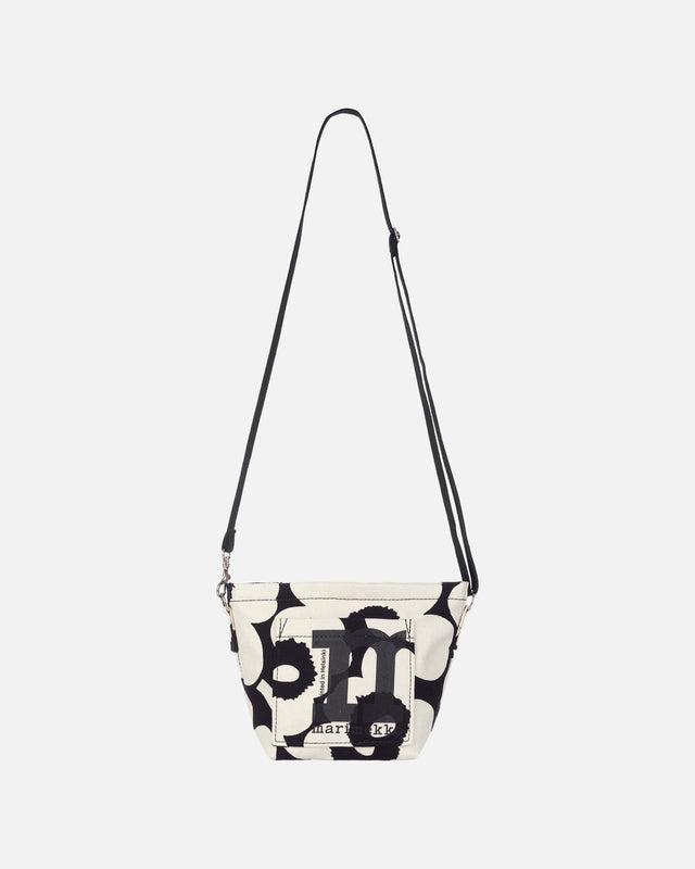 The Mono Mini Crossbody is made of unbleached organic cotton, which features the Unikko pattern printed in Helsinki. The shoulder bag has a zipper closure, an open pocket on the outside, and an adjustable shoulder strap.