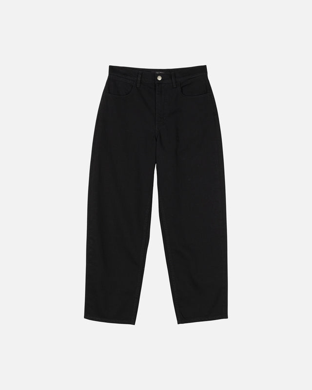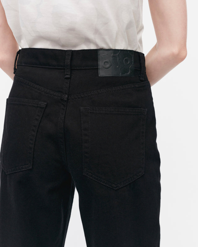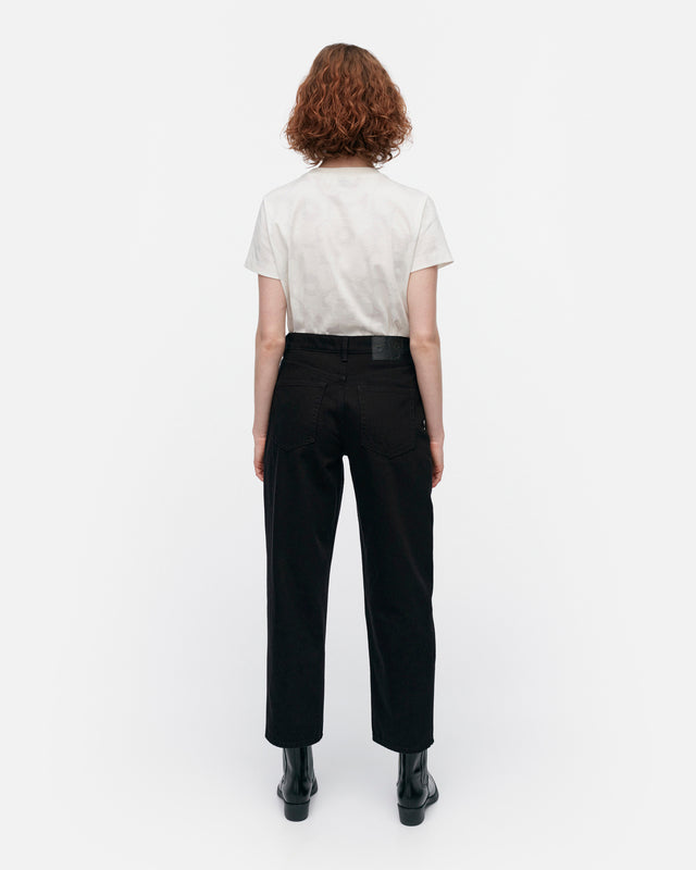 The stay black Maridenim Barrel jeans are made of non-stretch cotton denim. The 5-pocket jeans have a mid-rise waist with a relaxed fit and cropped legs with a curved cut. The jeans have Marimekko jean buttons and the Marimekko jean label in the back.