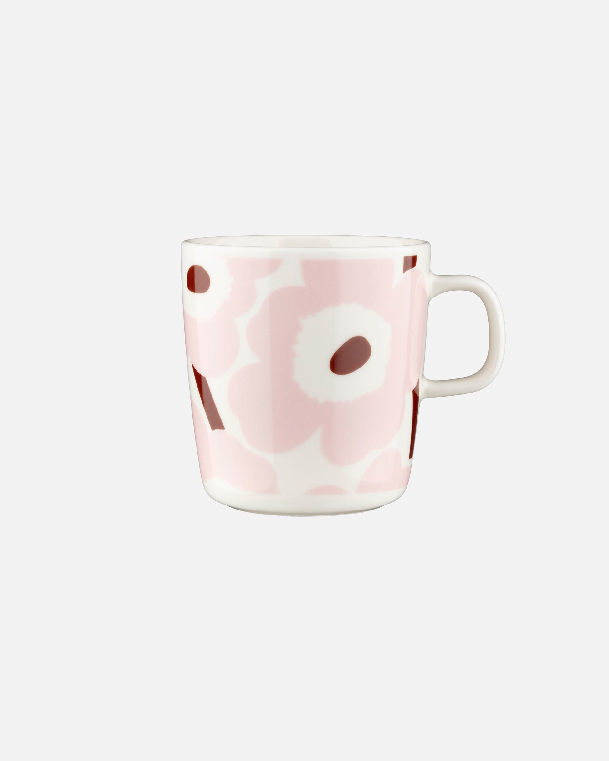 The large Oiva mug with Unikko pattern is made of white stoneware that is dishwasher, oven, microwave and freezer proof.