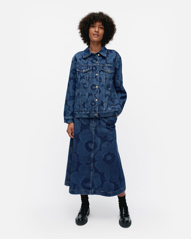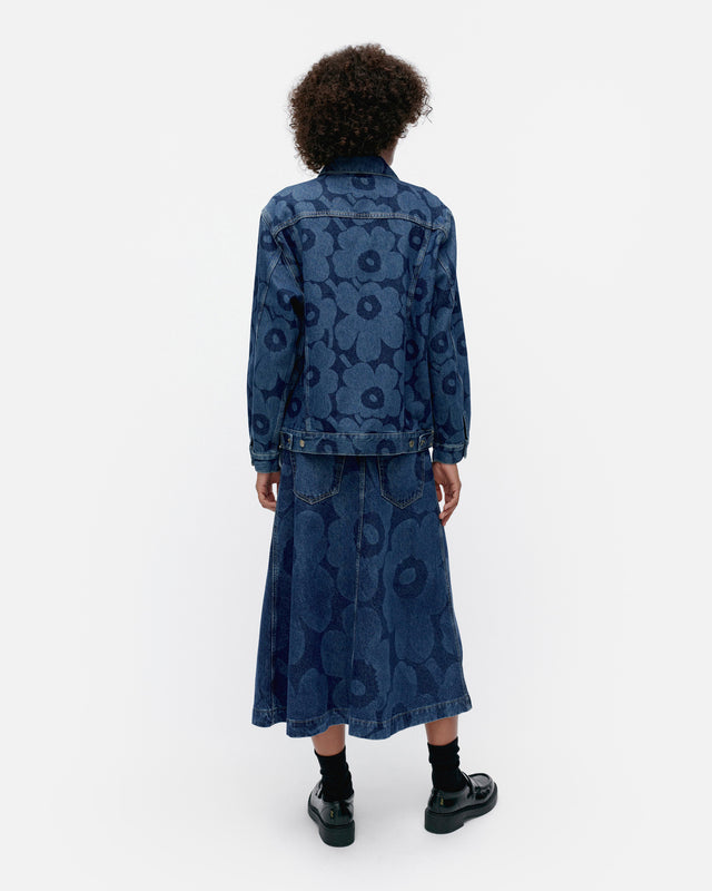 The mid-indigo Maridenim Murros jean jacket is made of non-stretch cotton denim in the Unikko pattern. The jacket has a relaxed fit, a button closure, button chest pockets with flaps, and side list pockets. The jacket has yoke seams in the front and back, button tabs at the back hemline, and cuffed sleeves with button closures. The jacket features Marimekko jean buttons.