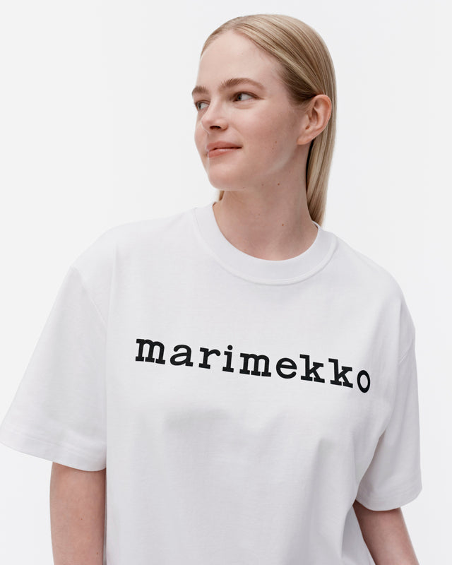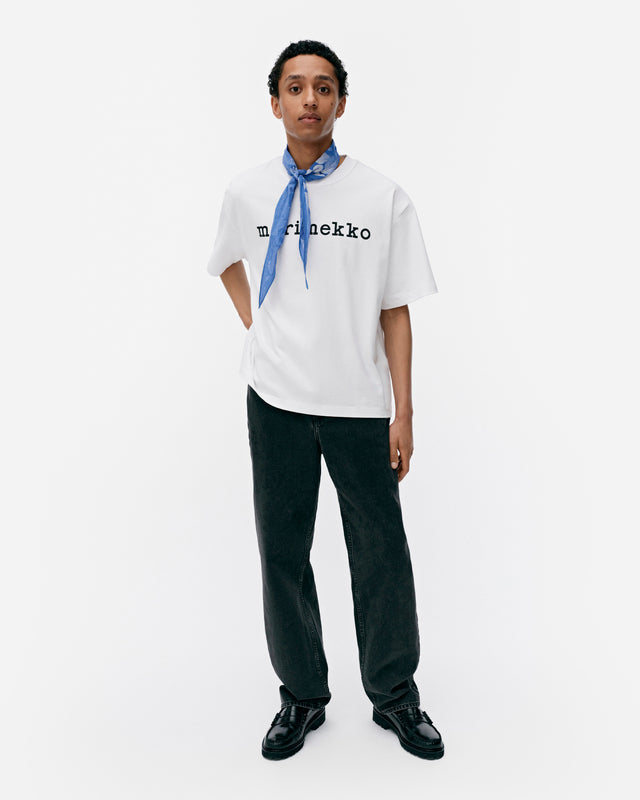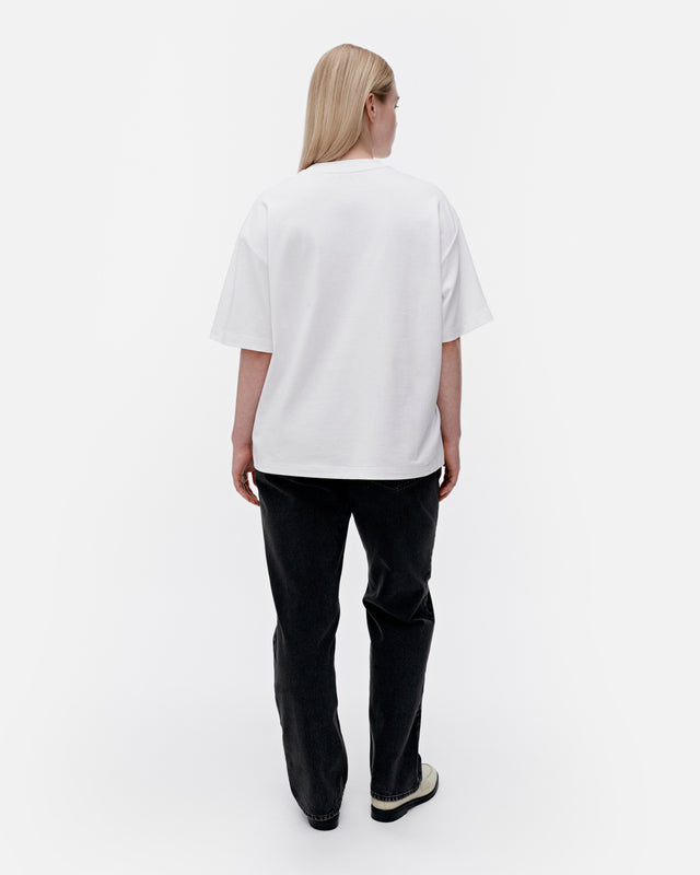 The oversized Veisto t-shirt is made of organic cotton jersey. The t-shirt features the printed Marimekko logo in the front and it has a ribbed O-neck.