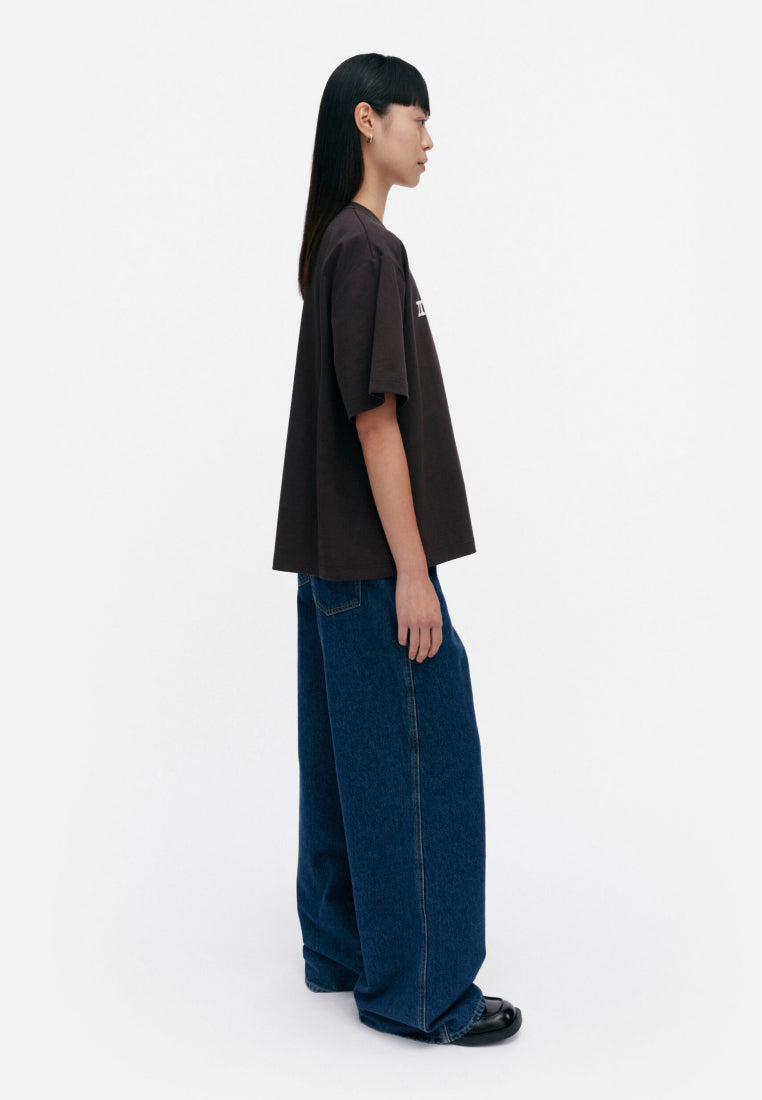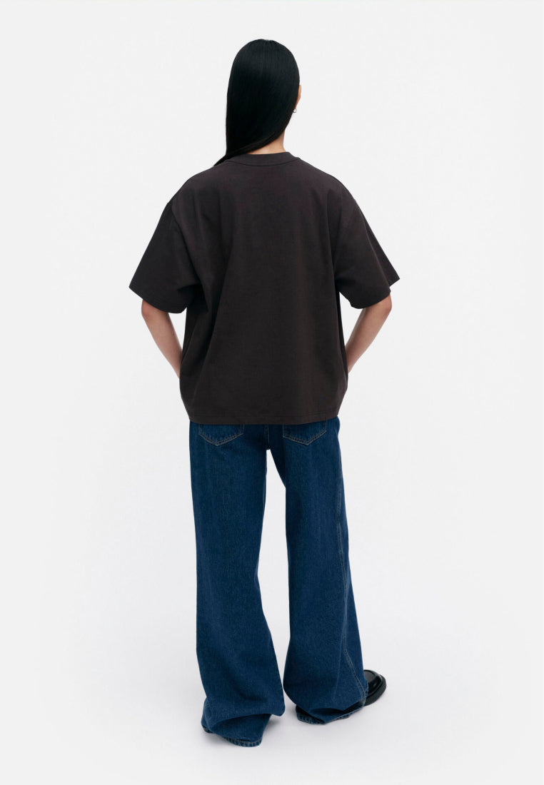 The oversized Veisto t-shirt is made of organic cotton jersey. The t-shirt features the printed Marimekko logo in the front and it has a ribbed O-neck.