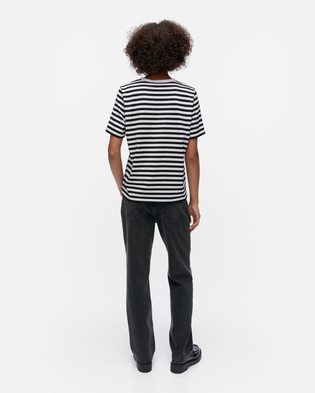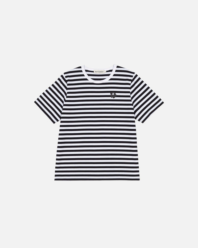 Tasaraita Unikko SS - top is made of cotton jersey. The shortsleeved top features the Tasaraita pattern, the small Unikko flower print in the front, and a ribbed O-neck. The fit is relaxed.