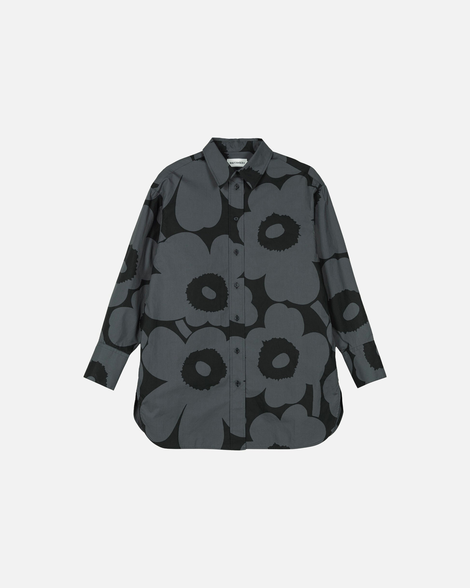 The Nila organic cotton poplin shirt has an oversized fit, a straight cut, and it is printed in the Unikko pattern. The shirt has a pointed collar, a button list, and cuffed sleeves with button closures. The curved hem has side slits.