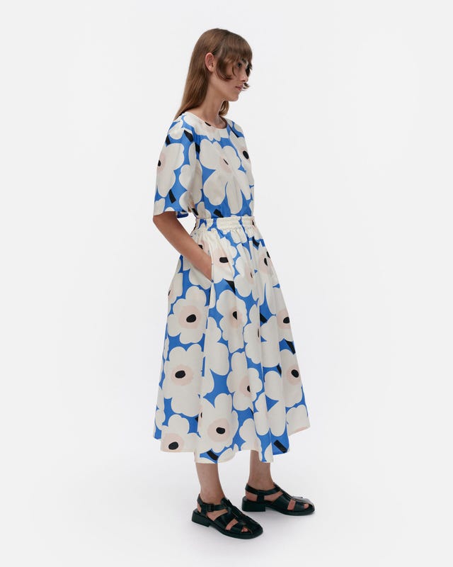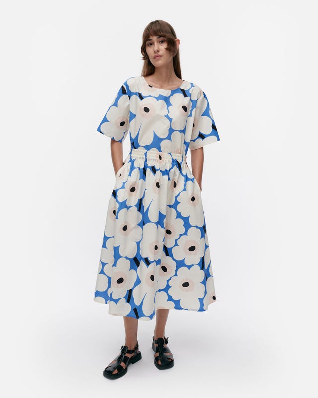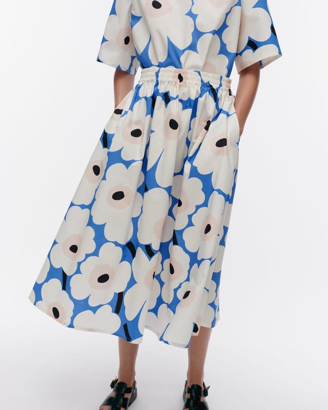The Garrel organic cotton poplin skirt has a relaxed, A-line fit and it features the Pieni Unikko pattern, which is printed in Helsinki. The skirt has an elastic waistband and side seam pockets.