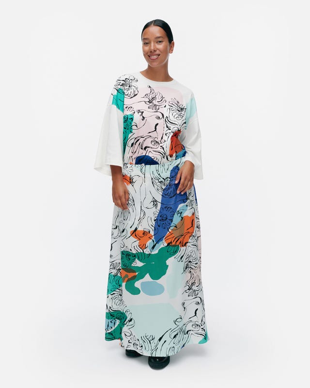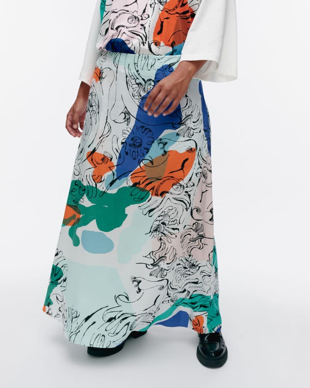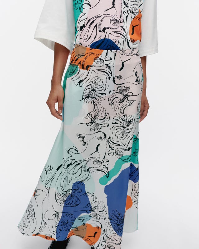 The Keveä skirt is made of a lyocell and viscose blend with a slim, A-line fit. The skirt features the Blomblom pattern and it has a concealed zipper in the back seam.