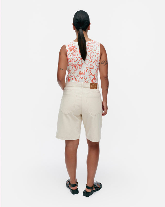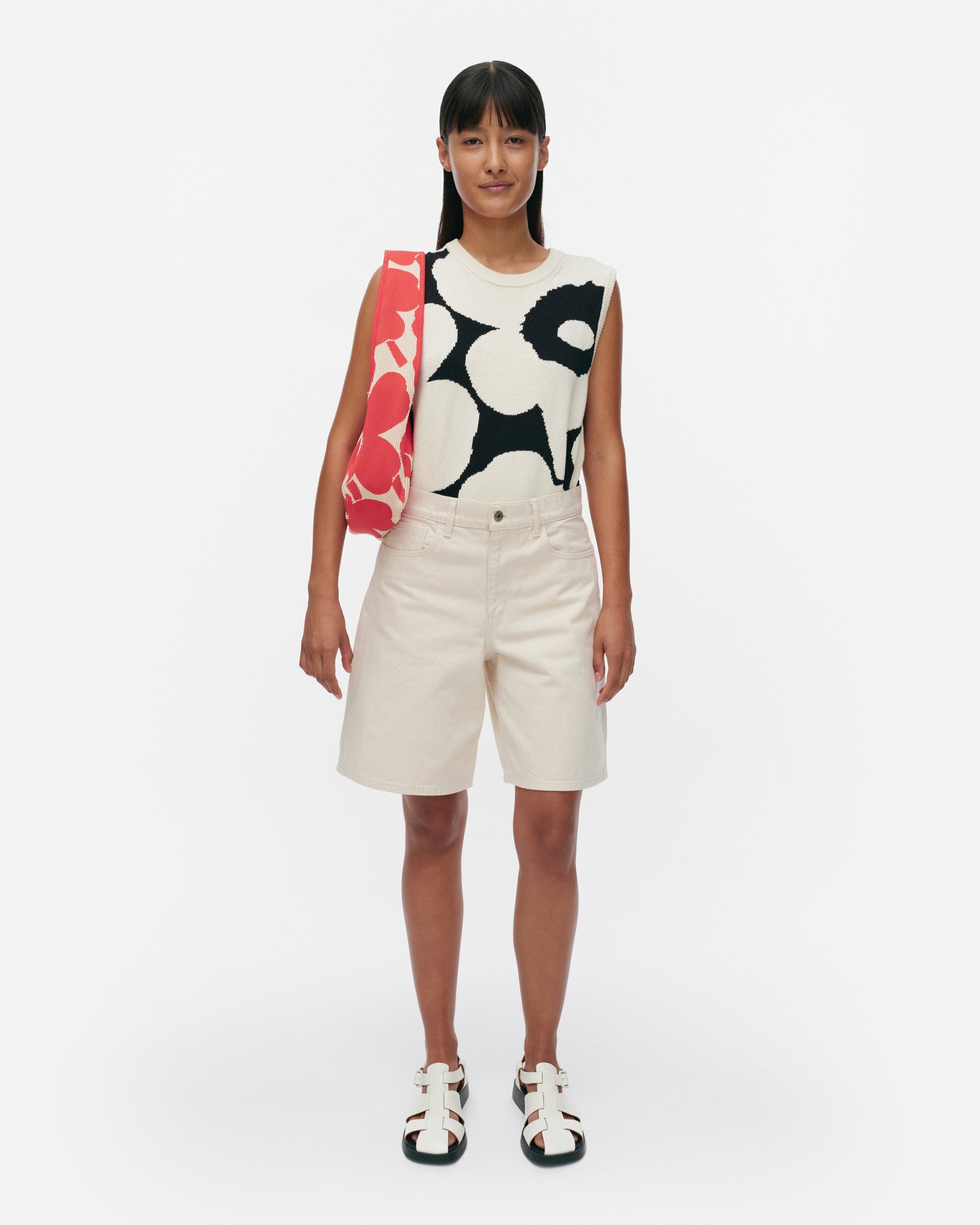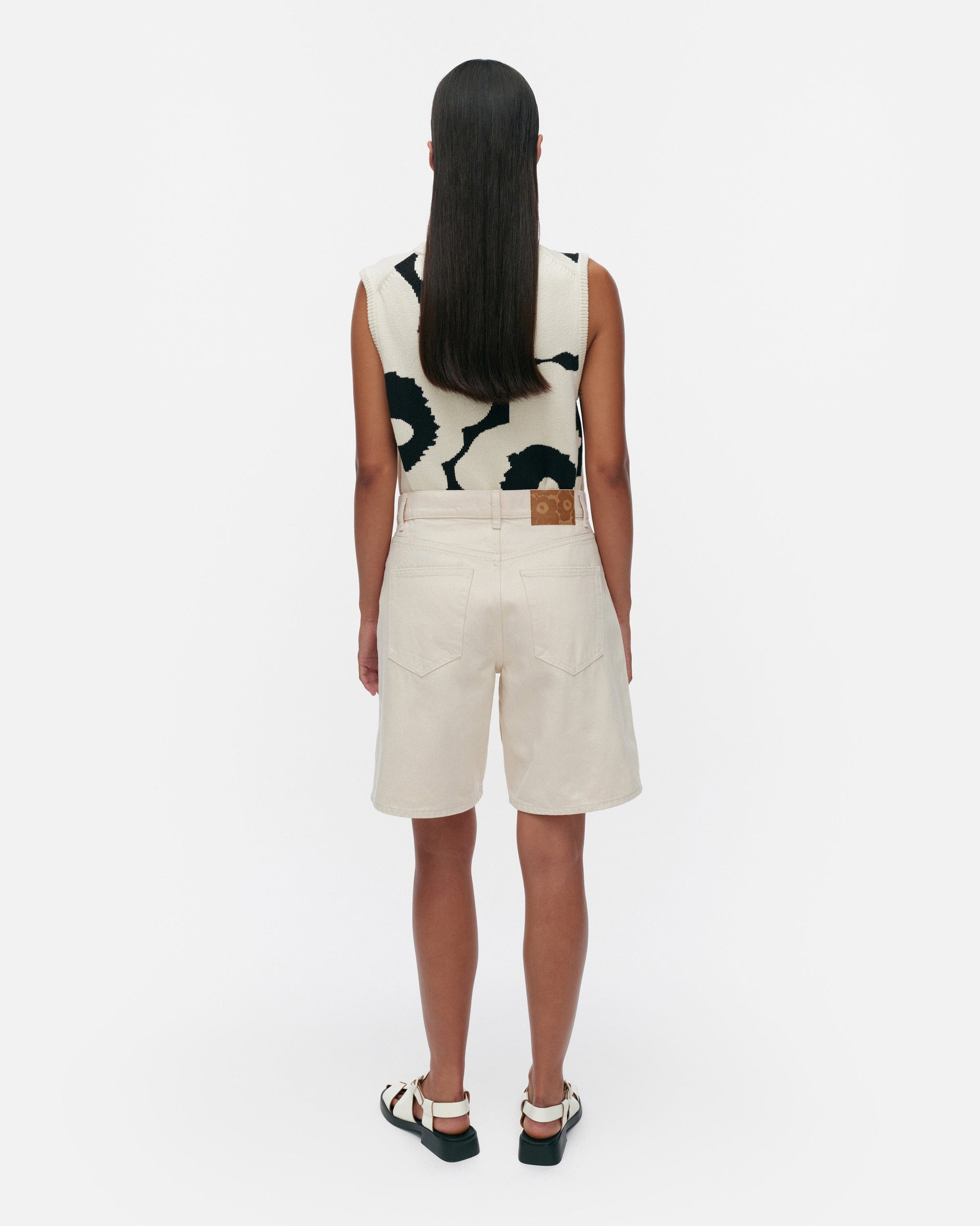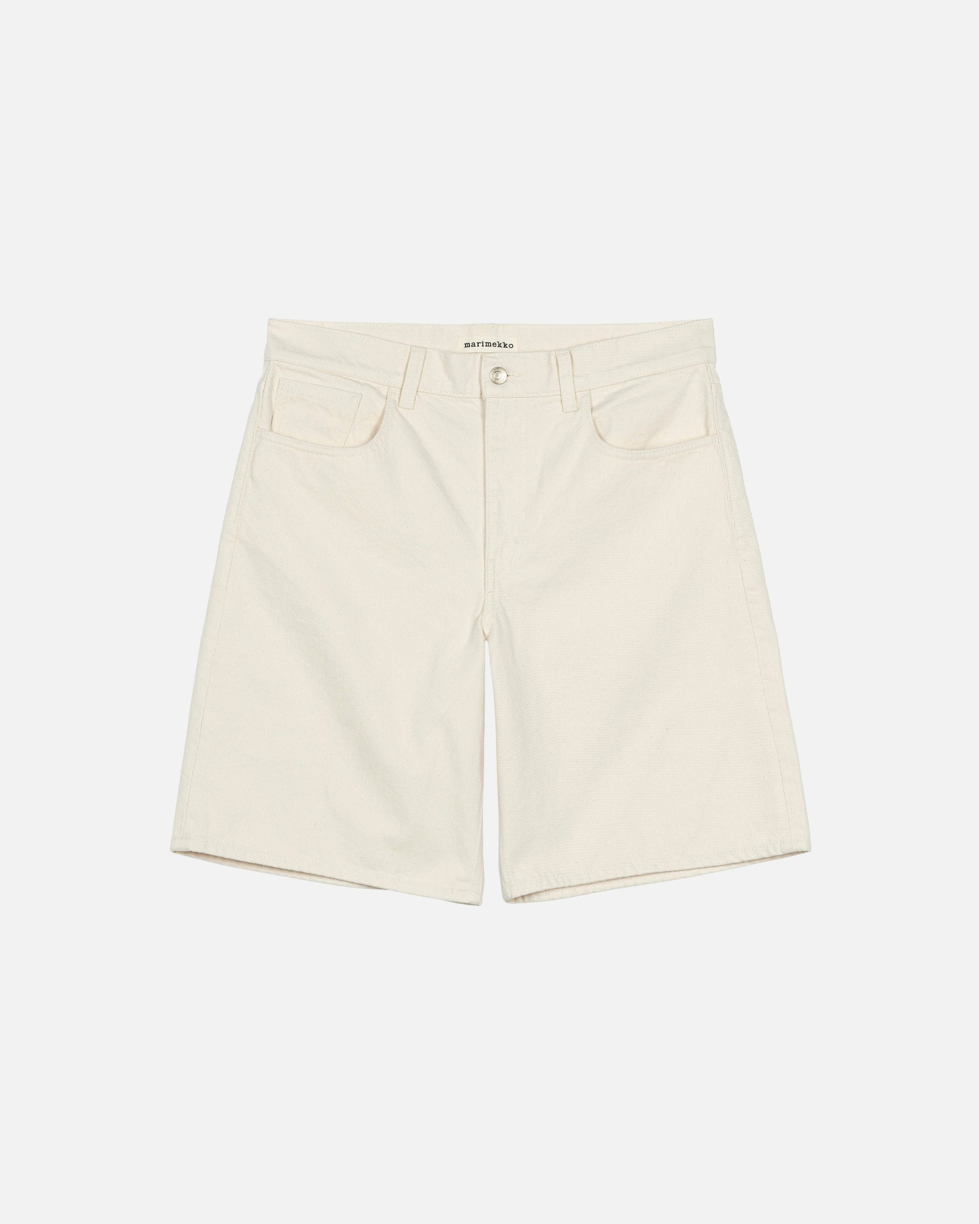 The natural white Maridenim Marssi jean shorts are made of non-stretch organic cotton denim. The classic 5-pocket jean shorts have a mid-rise waist and straight trouser legs. They have Marimekko jean buttons and the Marimekko jean label in the back which is made of FSC-certified jacron-material.