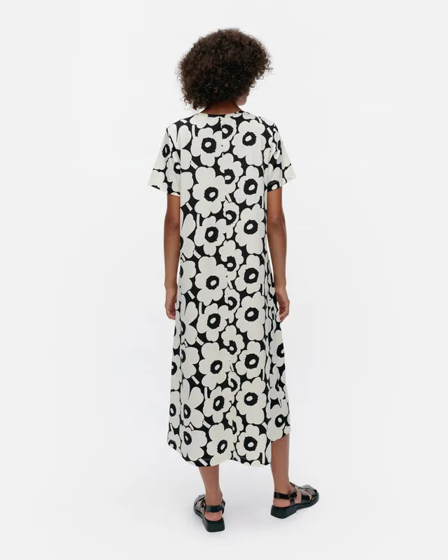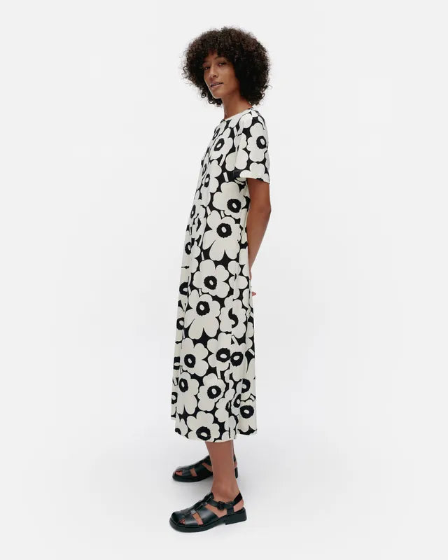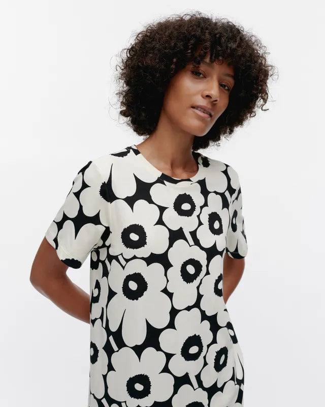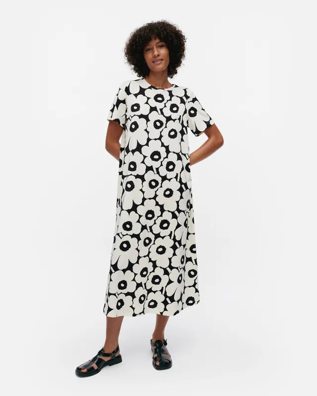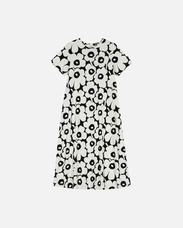 The Pisteinen t-shirt dress is made of organic cotton jersey and it has a slim, A-line fit. The dress features the Unikko pattern, an O-neck with a self-fabric finish, and a central seam in the back.