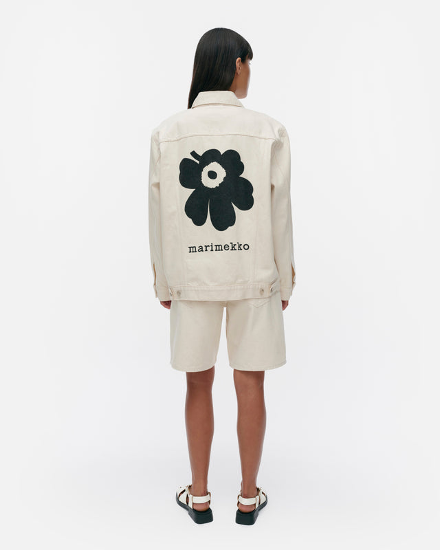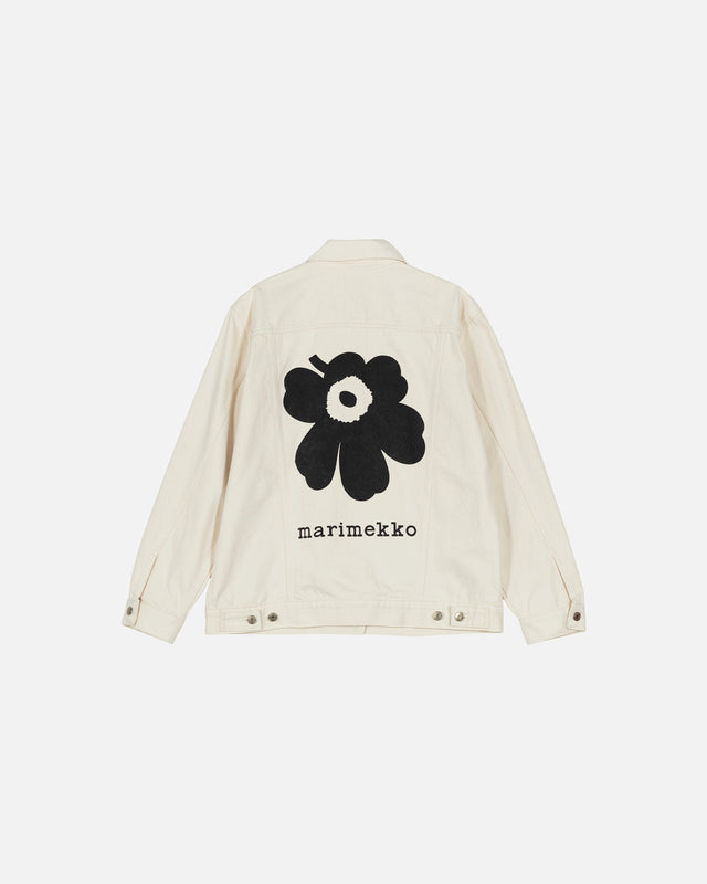 The natural white Maridenim Murros jean jacket is made of non-stretch organic cotton denim. The jacket has a relaxed fit, and it features the large printed Unikko flower and Marimekko logo in the back. It has a button closure, button chest pockets with flaps, and side list pockets. The jacket has yoke seams in the front and back, button tabs at the back hemline, and cuffed sleeves with button closures. The jacket features Marimekko jean buttons.