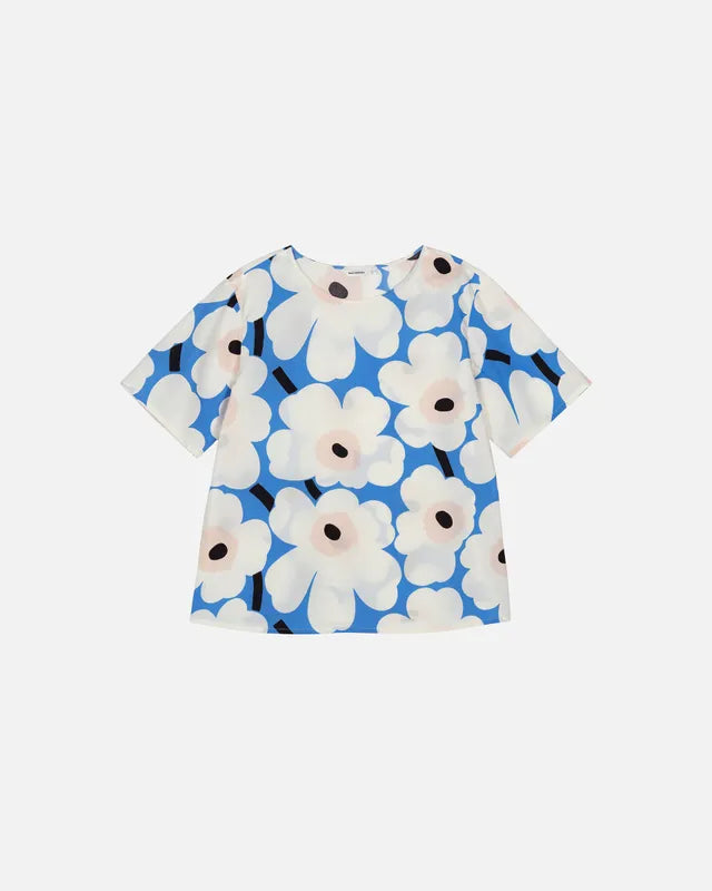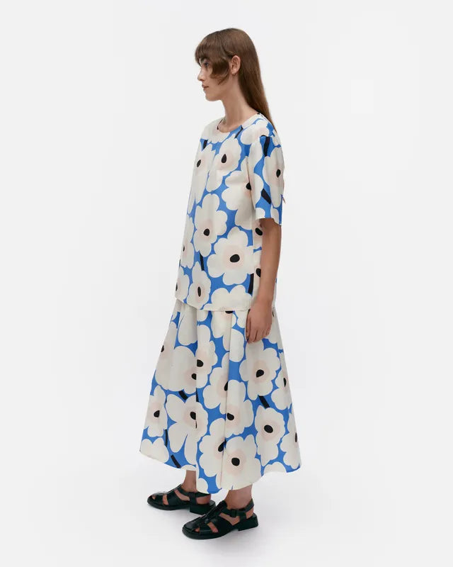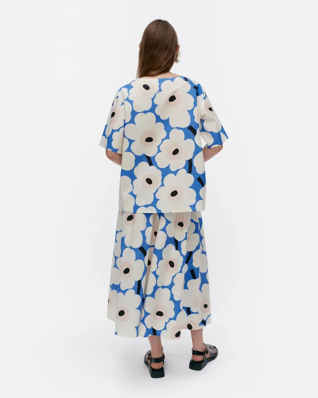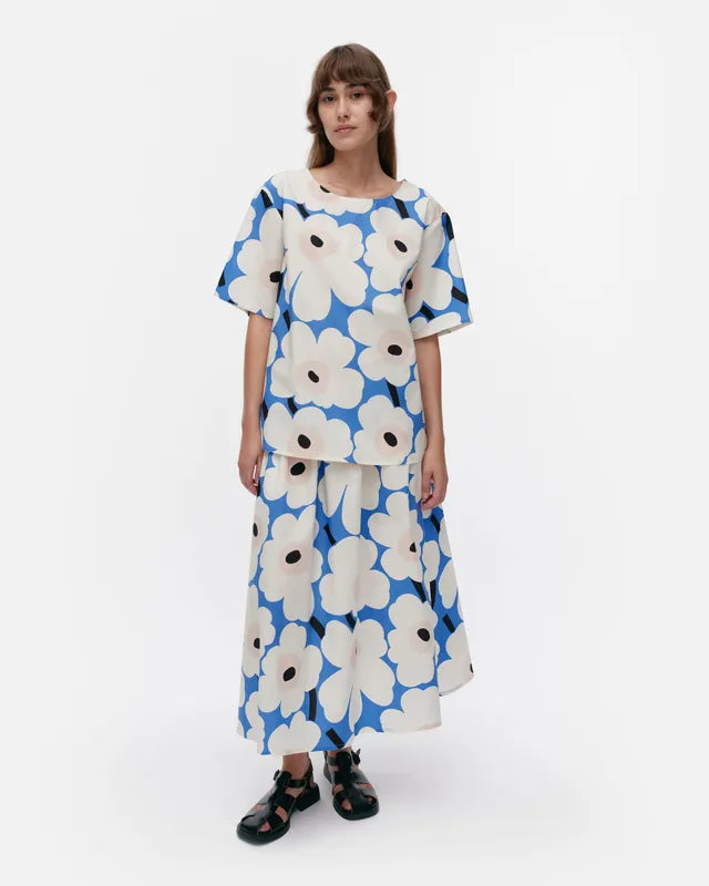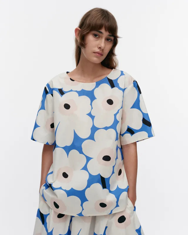 The Harso blouse is made of organic cotton poplin, and it has a relaxed, straight fit. The blouse features the Unikko pattern, which is printed in Helsinki. The blouse has an O-neck and loose, elbow-length sleeves.